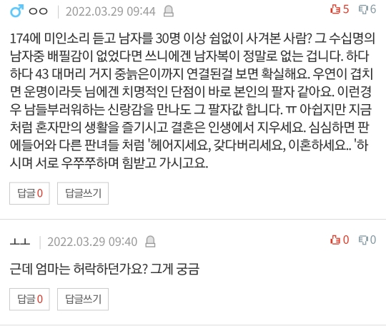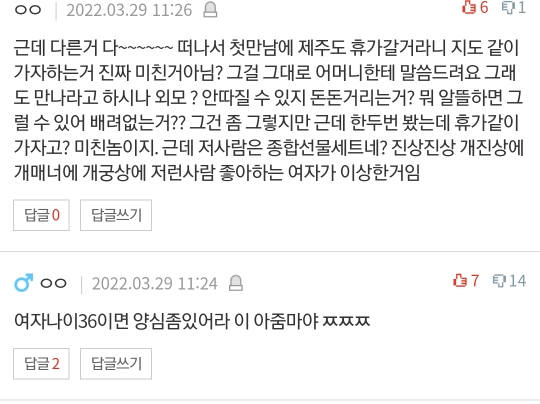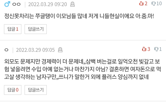 작성자인팁을내버려두세요 작성시간 23.01.15 이때싶 후려치기 시전하는 그남들 봐라ㅋㅋㅋ 한녀는 한남없어야 행복하게 즉는다ㅋㅋㅋ