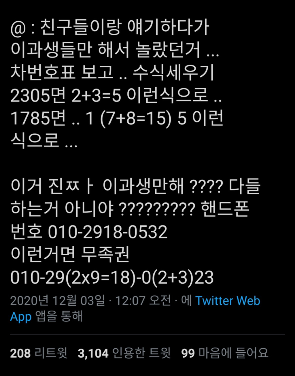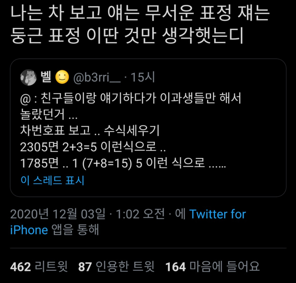 [스크랩] [흥미돋]이거 진ㅉㅏ 이과생만해 ???? 다들 하는거 아니야 ?????????.twt 작성자all day|작성시간23.01.18|조회수214,901 목록 댓글 257 글자크기 작게가 글자크기 크게가 출처 : https://twitter.com/b3rri__/status/1334152287313293312?s=20벨 ☺︎︎ on Twitter“@ : 친구들이랑 얘기하다가 이과생들만 해서 놀랐던거 ... 차번호표 보고 .. 수식세우기 2305면 2+3=5 이런식으로 .. 1785면 .. 1 (7+8=15) 5 이런 식으로 ... 이거 진ㅉㅏ 이과생만해 ???? 다들 하는거 아twitter.com아 RGrG... 다음검색 스크랩 원문 : *여성시대* 차분한 20대들의 알흠다운 공간 현재 게시글 추가 기능 열기 북마크 공유하기 신고 센터로 신고 댓글 댓글 257 댓글쓰기 답글쓰기 댓글 리스트 작성자다정하게따뜻하게유하게 | 작성시간 23.01.19 ㅡㅡ....???? 작성자떼르릉 | 작성시간 23.01.20 뼈문과 함 어려운건 못함 당연함 문과임 작성자나노셀 | 작성시간 23.01.20 문관데 해요 특히 자돋차번호팡ㅋㅋㅋㅋㅋ 작성자두비두밧 | 작성시간 23.01.22 단 한번도 해본적 없어... 작성자홈뇸뇸 | 작성시간 23.01.28 난 버스번호!! 기다리는 버스가 330인데 110번 버스가 오면 110번에서 220만 더하면 330번인데.. 하면서 아쉬움을 달래기돜ㅋㅋㅋ 댓글 전체보기