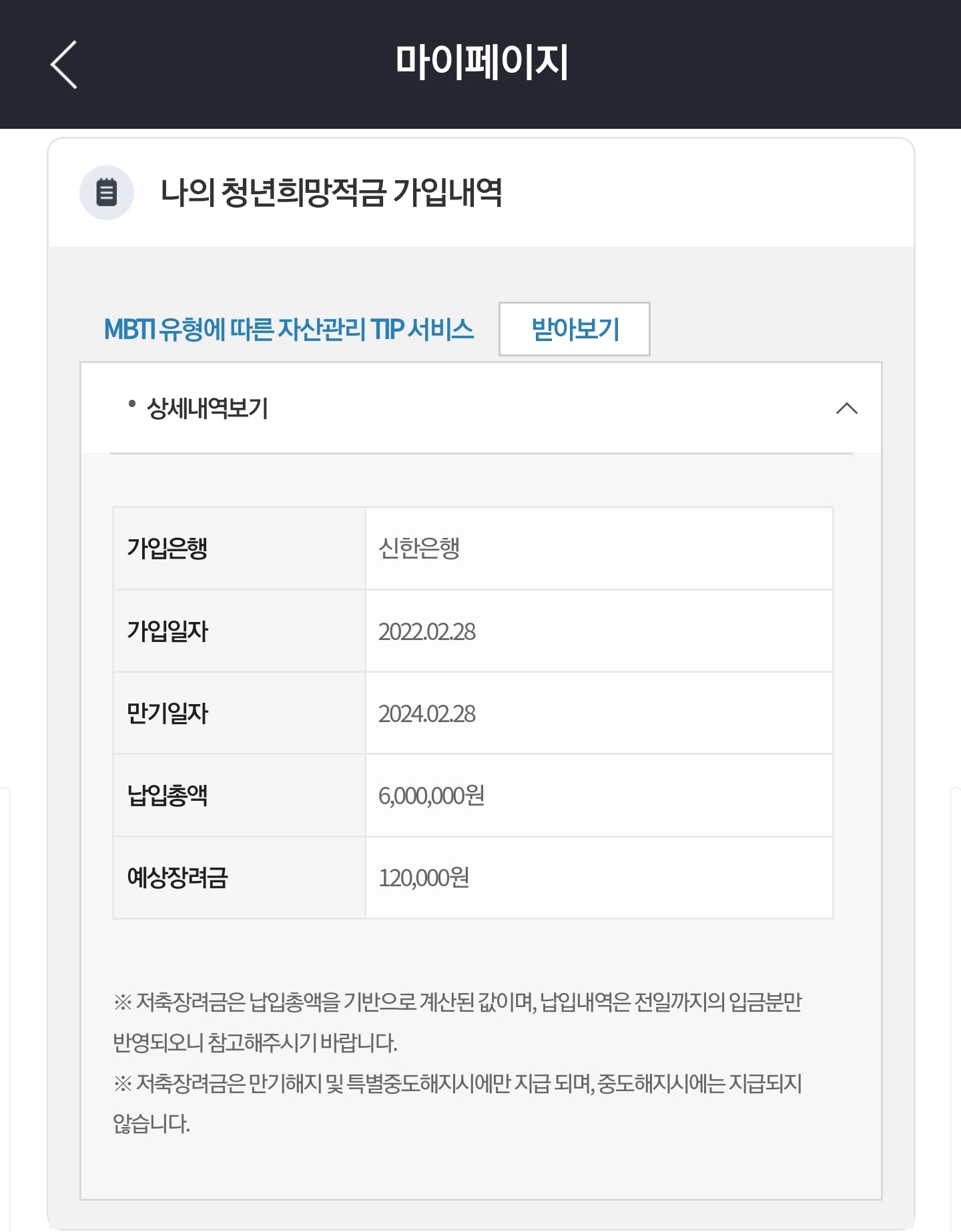 (로그인〉마이페이지〉나의 청년희망적금 가입내역〉상세내역보기)