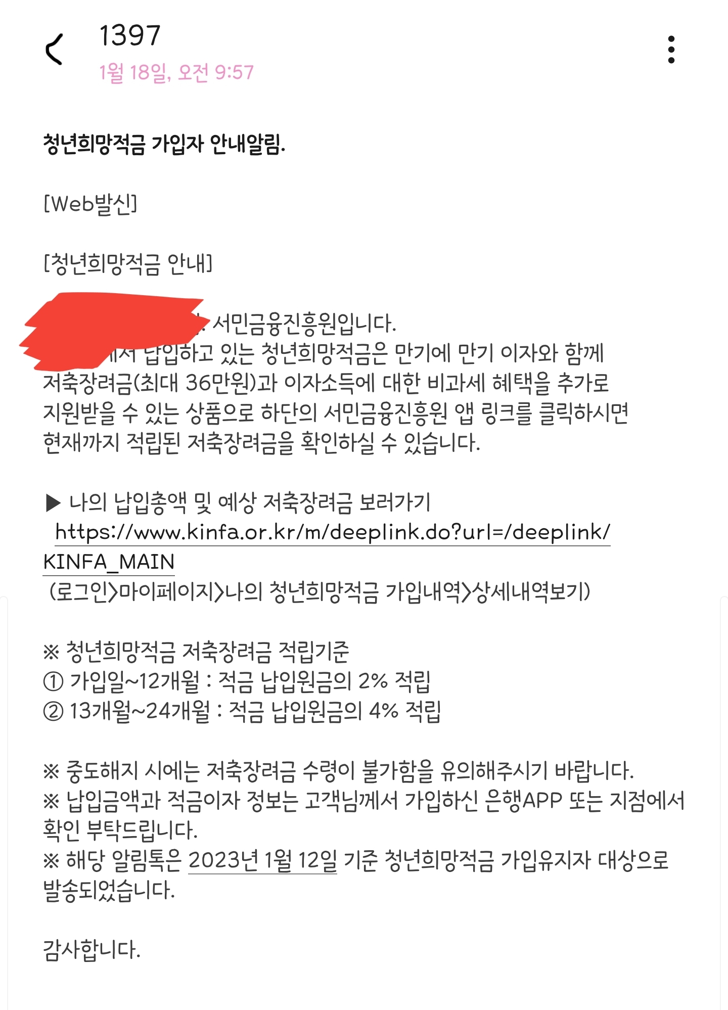※ 해당 알림톡은 2023년 1월 12일 기준 청년희망적금 가입유지자 대상으로 발송되었습니다.