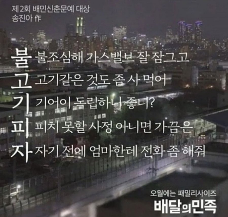 [흥미돋]배민 불고기피자 5행시로 대상받은 수상작.jpg 작성자인도카레|작성시간23.01.18|조회수143,116 목록 댓글 17 글자크기 작게가 글자크기 크게가 출처 : https://www.ppomppu.co.kr/zboard/view.php?id=humor&page=1&divpage=99&no=547276 배민 불고기피자 5행시로 대상받은 수상작.jpg여기를 눌러 링크를 확인하세요www.ppomppu.co.kr 다음검색 현재 게시글 추가 기능 열기 북마크 공유하기 신고 센터로 신고 댓글 댓글 17 댓글쓰기 답글쓰기 댓글 리스트 작성자곽두팔 왼팔 | 작성시간 23.01.18 ㅅㅂ롯데리아에서 배민으로 포장해서 기다리는중인데 ㅅㅂ 햄버거 기다리면서 처울고있네 작성자tltiltilt | 작성시간 23.01.18 나 저 글이 너무 뇌리에 박혀서 엄마한테 연락 자주자주함.. 엄마 좀 귀찮아하는뎈ㅋㅋ 그래도 계속 할거야 작성자대왕발 | 작성시간 23.01.18 왜 저를 울리세요 작성자인중사냥꾼 | 작성시간 23.01.18 작성자꼬꼬오 | 작성시간 23.01.18 와..ㅠㅠㅠㅠㅠㅠㅠ 댓글 전체보기