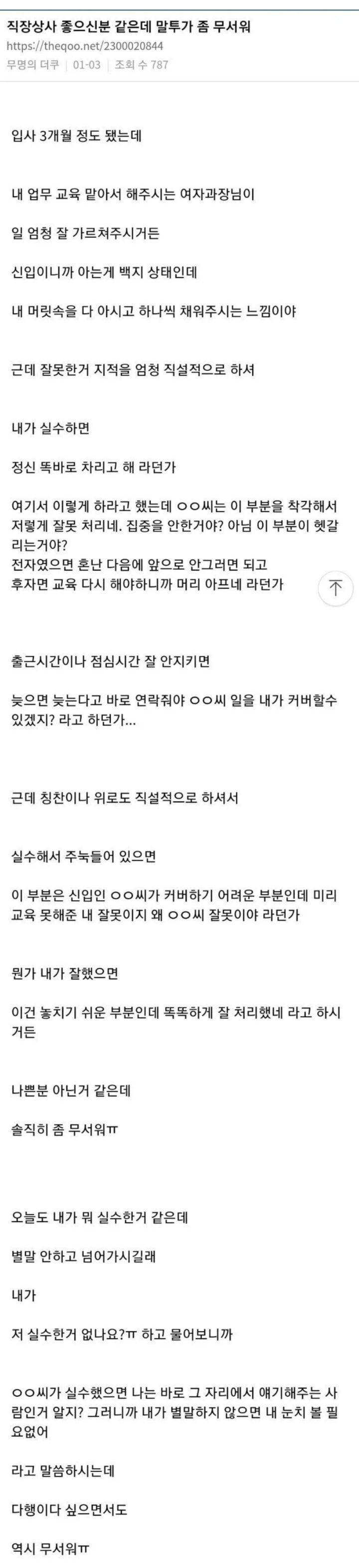 작성자럽미롭미 작성시간 23.01.18 근데 실수햇는데 상처받을까봐 돌려돌려 말하는거 싫어하는편이라그런가.. 너무좋음..
