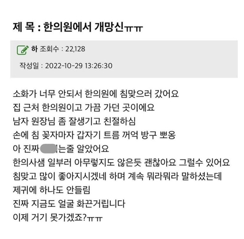 [흥미돋]한의원에서 망신 당한 썰 작성자일단똥을싸라|작성시간23.01.22|조회수56,368 목록 댓글 27 글자크기 작게가 글자크기 크게가 출처 : https://www.instagram.com/p/Cnl78_PrNLH/?igshid=MDJmNzVkMjY=Instagram의 세상에 이딴일이님 : "@rupin.kim 19) 왁싱 모델 하다가 발사한 썰…➡️ @rupin.kim"세상에 이딴일이님이 Instagram에 게시물을 공유했습니다:"@rupin.kim 19) 왁싱 모델 하다가 발사한 썰…➡️ @rupin.kim". 계정을 팔로우하여 게시물 4554개를 확인해보세요.www.instagram.com 다음검색 현재 게시글 추가 기능 열기 북마크 공유하기 신고 센터로 신고 댓글 댓글 27 댓글쓰기 답글쓰기 댓글 리스트 작성자송이송이눈꽃 | 작성시간 23.01.22 ㅋㅋ나였어도 크 역시 나야 이랬을거 작성자제주도푸른밤 | 작성시간 23.01.22 ㅋㅋㅋㅋㅋㅋㅋㅋ개웃기닼ㅋㅋㅋㅋㅋ뿌듯하겠노 작성자두명만암살사소스 | 작성시간 23.01.22 최소이민 작성자겨우루우루 | 작성시간 23.01.22 어디야 나도 가고 싶어ㅋㅋㅋㅋㅋㅋ 작성자lenini | 작성시간 23.01.22 내가 바로 허준 댓글 전체보기