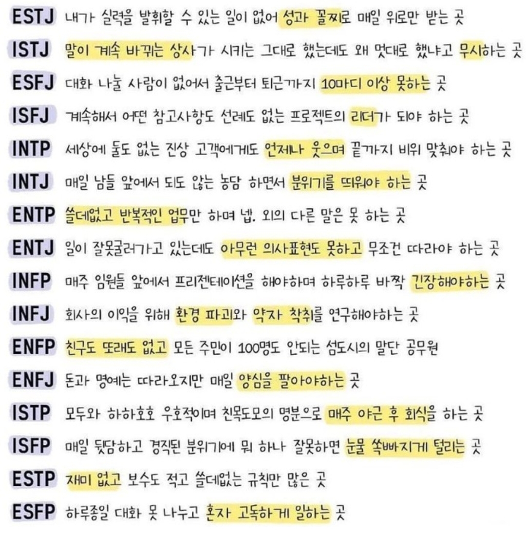 [흥미돋]MBTI별 퇴사하고 싶은 직장 분위기 작성자NO:ZE|작성시간23.01.25|조회수44,950 목록 댓글 158 글자크기 작게가 글자크기 크게가 출처 : https://www.instagram.com/p/Cnyu7_6vhrN/?igshid=YmMyMTA2M2Y=Instagram의 쭌이덕MBTI님 : "MBTI별 퇴사마려운 직장 분위기주변 3인 극공감 나 본인 공감근데 읽406 Likes, 19 Comments - 쭌이덕MBTI (@mbti_zzuneduck) on Instagram: "MBTI별 퇴사마려운 직장 분위기 주변 3인 극공감 나 본인 공감 근데 읽다보니까 대부분 하기 싫은데 ? ㅋㅋㅋㅋㅋ 그나마 개인적으로 ISFJ 쪽www.instagram.comENFP 여시인데 나 10분만에 또래랑 친해져서 짱친 먹었거든 나 진짜 죽음 헉 다음검색 현재 게시글 추가 기능 열기 북마크 공유하기 신고 센터로 신고 댓글 댓글 158 댓글쓰기 답글쓰기 댓글 리스트 작성자빵라이 | 작성시간 23.01.26 enfp 글자만 봐도 숨막혀서 죽을거같앸ㅋㅋㅋㅋestj빼고 e형은 다 숨막혀 작성자그렇다고 | 작성시간 23.01.26 헐 대박 내 퇴사이유 나와있네 작성자23년도원하는바그렇게될거야 | 작성시간 23.01.26 왘ㅋㅋㅋ공감 작성자모르는 개 산책이면 아는 개 힝이다. | 작성시간 23.01.26 매주 야근 후 회식 이러고있네 듣자마자 바로 퇴사각이다 작성자총각김치남 | 작성시간 23.01.27 으악 댓글 전체보기