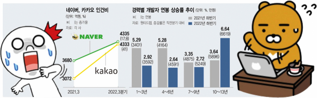 26일 서울경제가 인적자원(HR) 테크 기업 원티드랩에 의뢰해 국민연금 자료를 토대로 경력별 개발자 연봉을 분석한 결과 2021년 5%대를 기록하던 신입의 연봉 증가율이 지난해 하반기에는 2%대로 뚝 떨어졌다. 반면 10년 차 이상 경력자의 연봉 증가율은 같은 기간 3%대에서 6%대로 급등했다. 지난해 연봉도 2배 가까이 차이가 났다.구체적으로 경력 1~3년 차 개발자의 평균 연봉은 2021년 상반기 3230만 원에서 하반기 3401만 원으로 5.29% 증가했다가 지난해에는 상반기 3490만 원, 하반기 3592만 원으로 증가율이 2.92%로 줄었다. 4~6년 차 경력 개발자는 5.28%에서 2.64%로, 7~9년 차는 3.35%에서 2.72%로 연봉 증가율이 줄었다. 반면 10~12년 차의 경우 재작년 상반기 5689만 원에서 하반기 5896만 원으로 3.64% 증가해 신입보다 연봉 증가율이 적었다. 하지만 지난해에는 상반기 6207만 원, 하반기 6619만 원으로 연봉 증가율이 6.64%에 달해 신입 개발자 연봉 증가율의 2배 이상이었다. 업계 관계자는 “코딩 학원 등으로 개발자가 많이 양성돼도 기업들이 찾는 능력 있는 개발자는 늘 부족하다”며 “인건비 부담을 느끼는 기업들이 신입 대신 바로 실무 투입이 가능한 10년 차 이상을 선호하는 현상이 뚜렷해졌다”고 말했다.