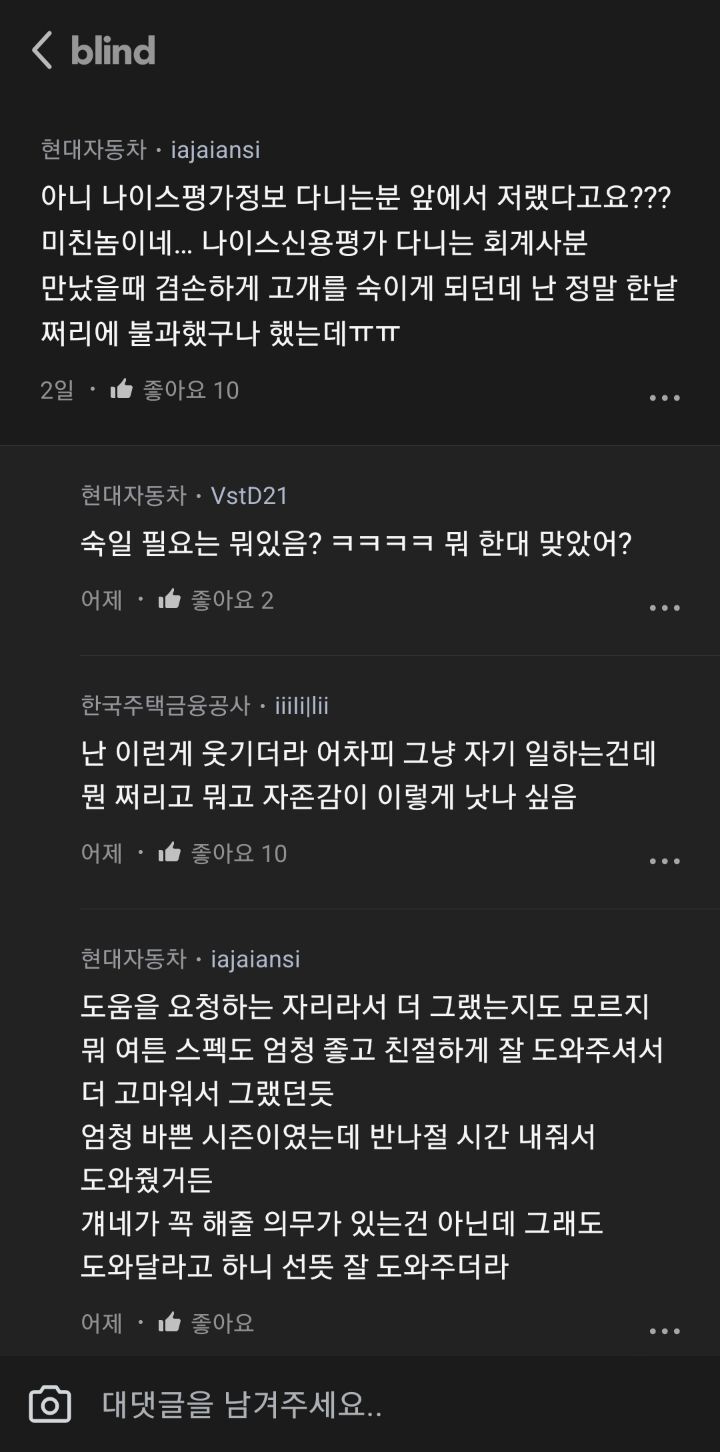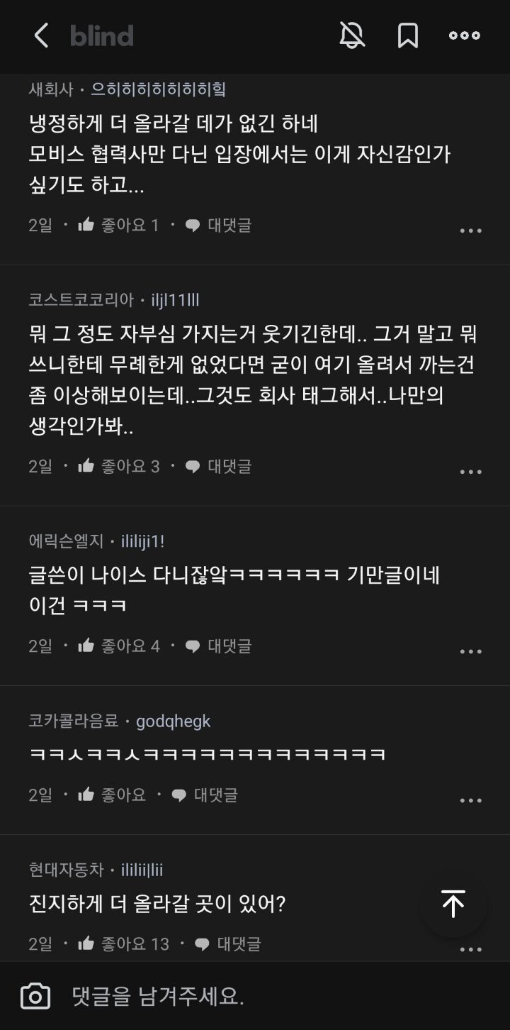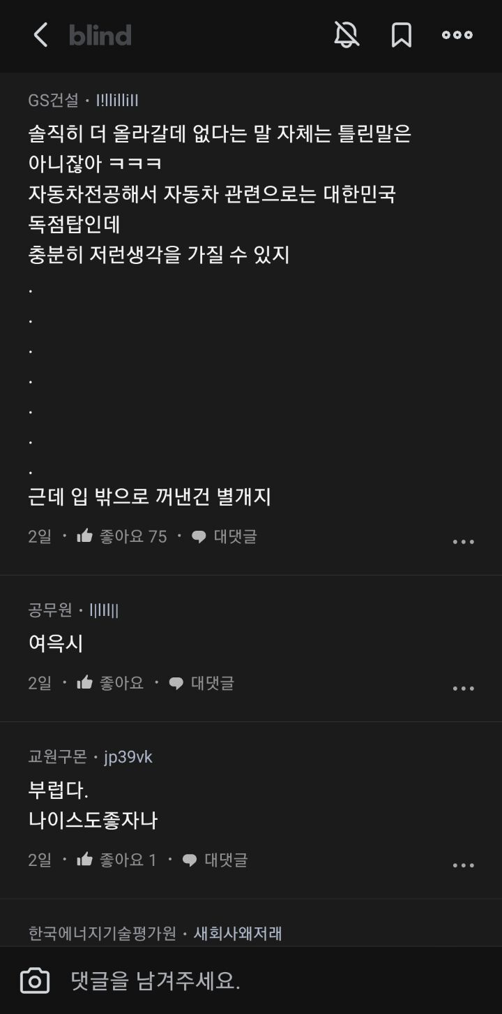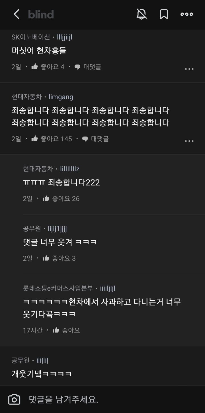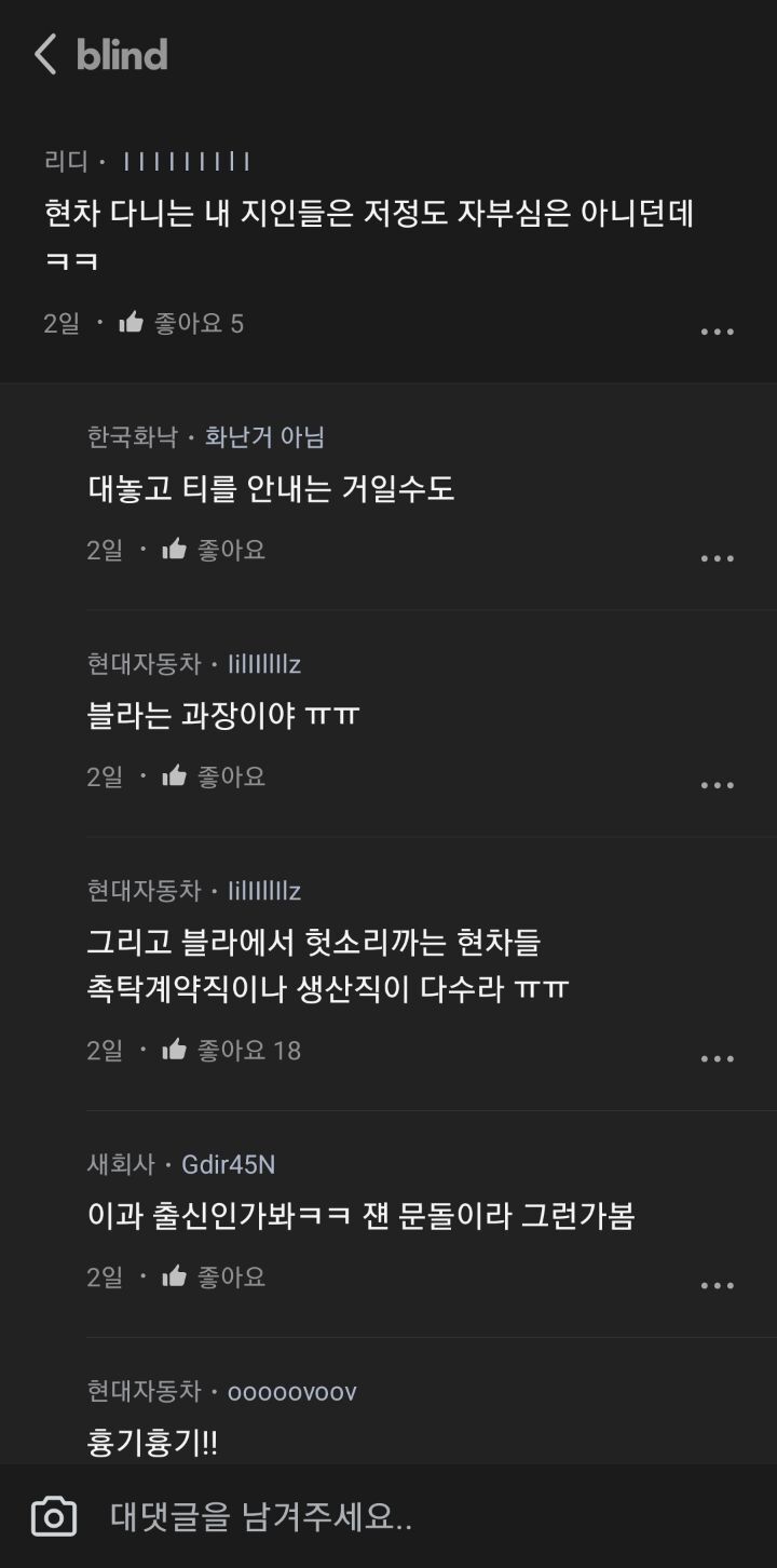 [스크랩] [흥미돋]킹차 갓무직. 대답이 됐으려나? 작성자flflf|작성시간23.01.27|조회수7,932 목록 댓글 14 글자크기 작게가 글자크기 크게가 출처 : https://kr.teamblind.com/s/DH1dfmvk블라블라: 킹차갓무직과의 만남썰킹차갓무직인 분이 하도 집요하게 커피마시자고 연락와서 주말에 만남.이런저런 대화 중에 이직이야기를 하다가 첫직장인지 물어봤는데, 그분은 첫직장이며 한번도 이직한적이 없다고 했음.나www.teamblind.comㅁㅂ 다음검색 스크랩 원문 : *여성시대* 차분한 20대들의 알흠다운 공간 현재 게시글 추가 기능 열기 북마크 공유하기 신고 센터로 신고 댓글 댓글 14 댓글쓰기 답글쓰기 댓글 리스트 작성자탕탕탕후루 | 작성시간 23.01.27 주가나 올려라 작성자일단똥을싸라 | 작성시간 23.01.27 아 이제 뉴스나 이런데서 현대차얘기만 나오면 킹차갓무직 생각나서 콧구멍 커진다고 ㅋㅋㅋㅋㅋㅋㅋ큐 작성자타오하우 | 작성시간 23.01.27 시발ㅋㅋㅋㅋㅋ진짜개웃김 작성자달밤의꽃 | 작성시간 23.01.27 꼭 저기 다니는 애들만 현다이맨 이딴거 플필에 씀 작성자늘배고프다 | 작성시간 23.01.27 정병이다 댓글 전체보기