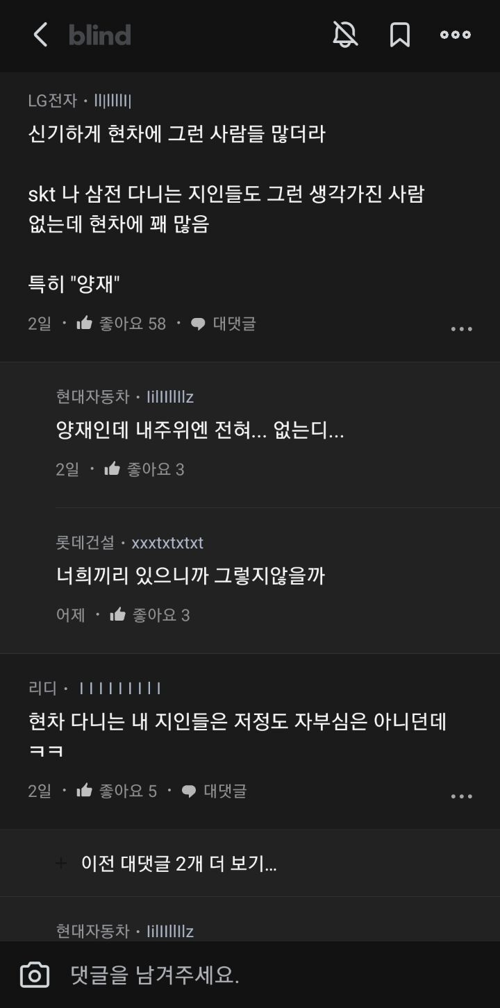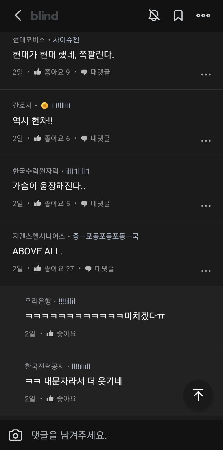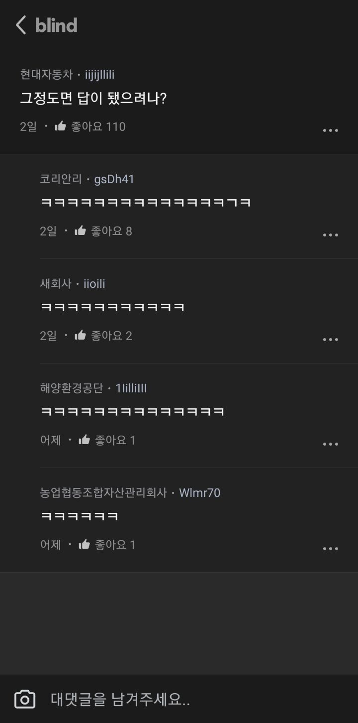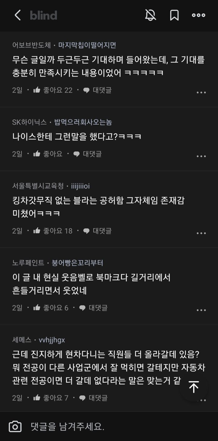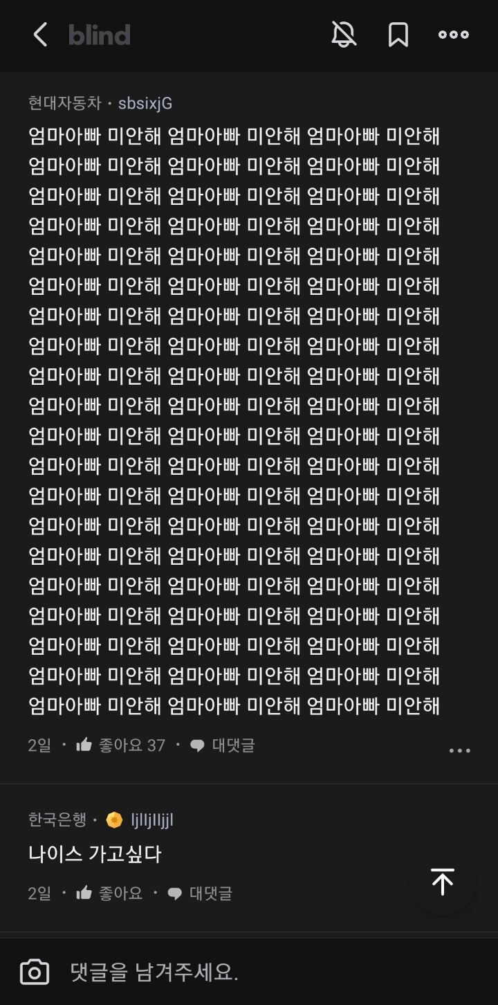 [스크랩] [흥미돋]킹차 갓무직. 대답이 됐으려나? 작성자flflf|작성시간23.01.27|조회수7,932 목록 댓글 14 글자크기 작게가 글자크기 크게가 출처 : https://kr.teamblind.com/s/DH1dfmvk블라블라: 킹차갓무직과의 만남썰킹차갓무직인 분이 하도 집요하게 커피마시자고 연락와서 주말에 만남.이런저런 대화 중에 이직이야기를 하다가 첫직장인지 물어봤는데, 그분은 첫직장이며 한번도 이직한적이 없다고 했음.나www.teamblind.comㅁㅂ 다음검색 스크랩 원문 : *여성시대* 차분한 20대들의 알흠다운 공간 현재 게시글 추가 기능 열기 북마크 공유하기 신고 센터로 신고 댓글 댓글 14 댓글쓰기 답글쓰기 댓글 리스트 작성자탕탕탕후루 | 작성시간 23.01.27 주가나 올려라 작성자일단똥을싸라 | 작성시간 23.01.27 아 이제 뉴스나 이런데서 현대차얘기만 나오면 킹차갓무직 생각나서 콧구멍 커진다고 ㅋㅋㅋㅋㅋㅋㅋ큐 작성자타오하우 | 작성시간 23.01.27 시발ㅋㅋㅋㅋㅋ진짜개웃김 작성자달밤의꽃 | 작성시간 23.01.27 꼭 저기 다니는 애들만 현다이맨 이딴거 플필에 씀 작성자늘배고프다 | 작성시간 23.01.27 정병이다 댓글 전체보기