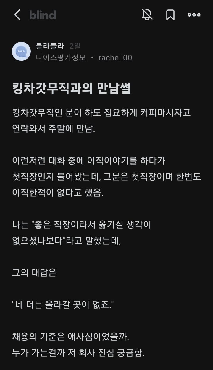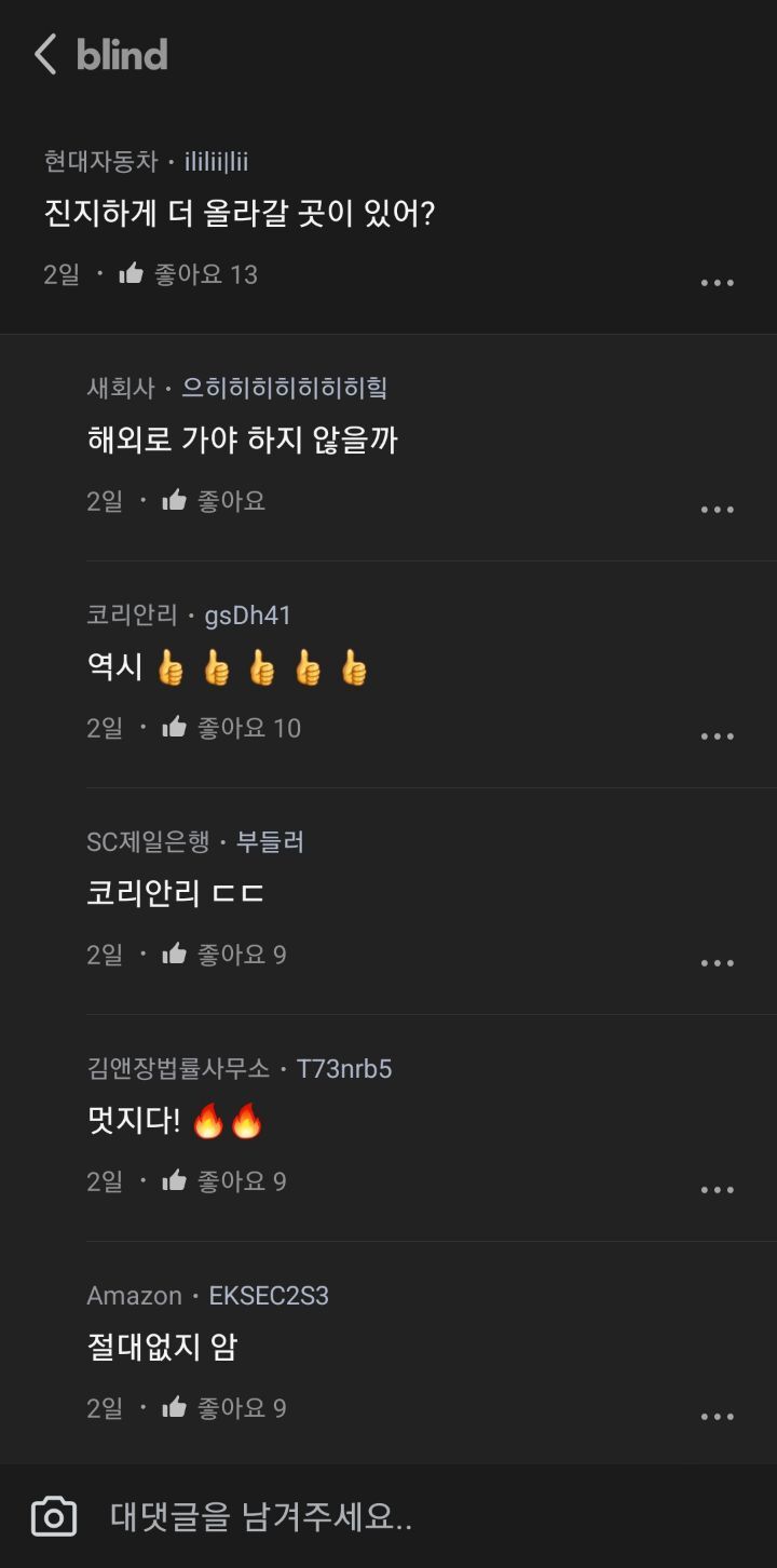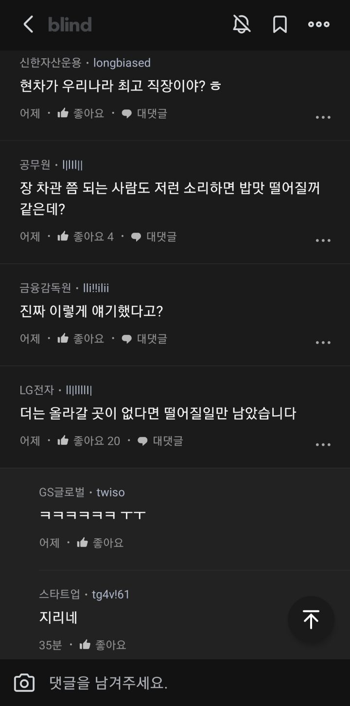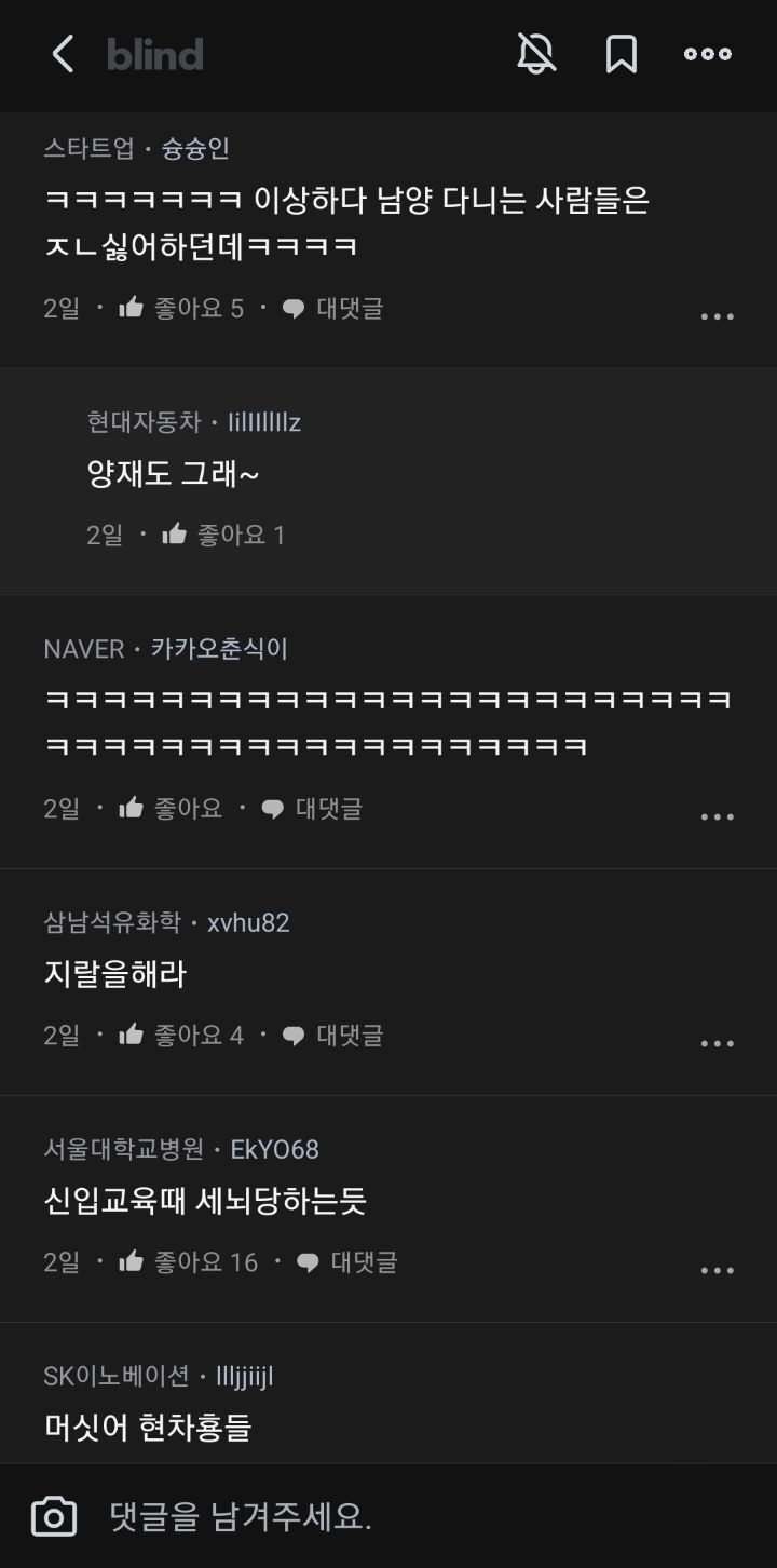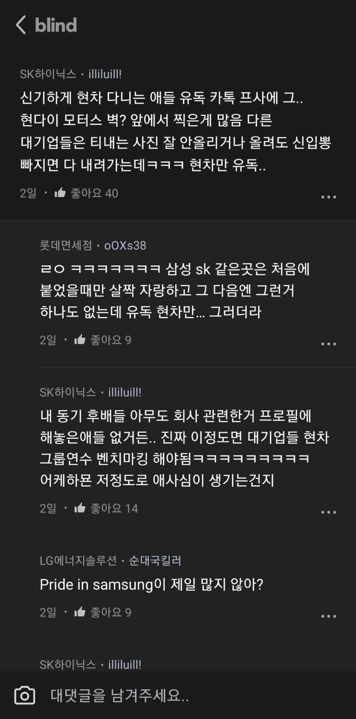 [스크랩] [흥미돋]킹차 갓무직. 대답이 됐으려나? 작성자flflf|작성시간23.01.27|조회수7,932 목록 댓글 14 글자크기 작게가 글자크기 크게가 출처 : https://kr.teamblind.com/s/DH1dfmvk블라블라: 킹차갓무직과의 만남썰킹차갓무직인 분이 하도 집요하게 커피마시자고 연락와서 주말에 만남.이런저런 대화 중에 이직이야기를 하다가 첫직장인지 물어봤는데, 그분은 첫직장이며 한번도 이직한적이 없다고 했음.나www.teamblind.comㅁㅂ 다음검색 스크랩 원문 : *여성시대* 차분한 20대들의 알흠다운 공간 현재 게시글 추가 기능 열기 북마크 공유하기 신고 센터로 신고 댓글 댓글 14 댓글쓰기 답글쓰기 댓글 리스트 작성자탕탕탕후루 | 작성시간 23.01.27 주가나 올려라 작성자일단똥을싸라 | 작성시간 23.01.27 아 이제 뉴스나 이런데서 현대차얘기만 나오면 킹차갓무직 생각나서 콧구멍 커진다고 ㅋㅋㅋㅋㅋㅋㅋ큐 작성자타오하우 | 작성시간 23.01.27 시발ㅋㅋㅋㅋㅋ진짜개웃김 작성자달밤의꽃 | 작성시간 23.01.27 꼭 저기 다니는 애들만 현다이맨 이딴거 플필에 씀 작성자늘배고프다 | 작성시간 23.01.27 정병이다 댓글 전체보기