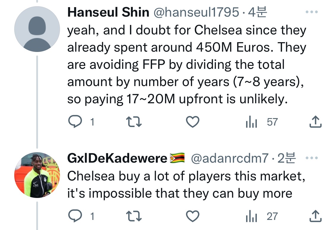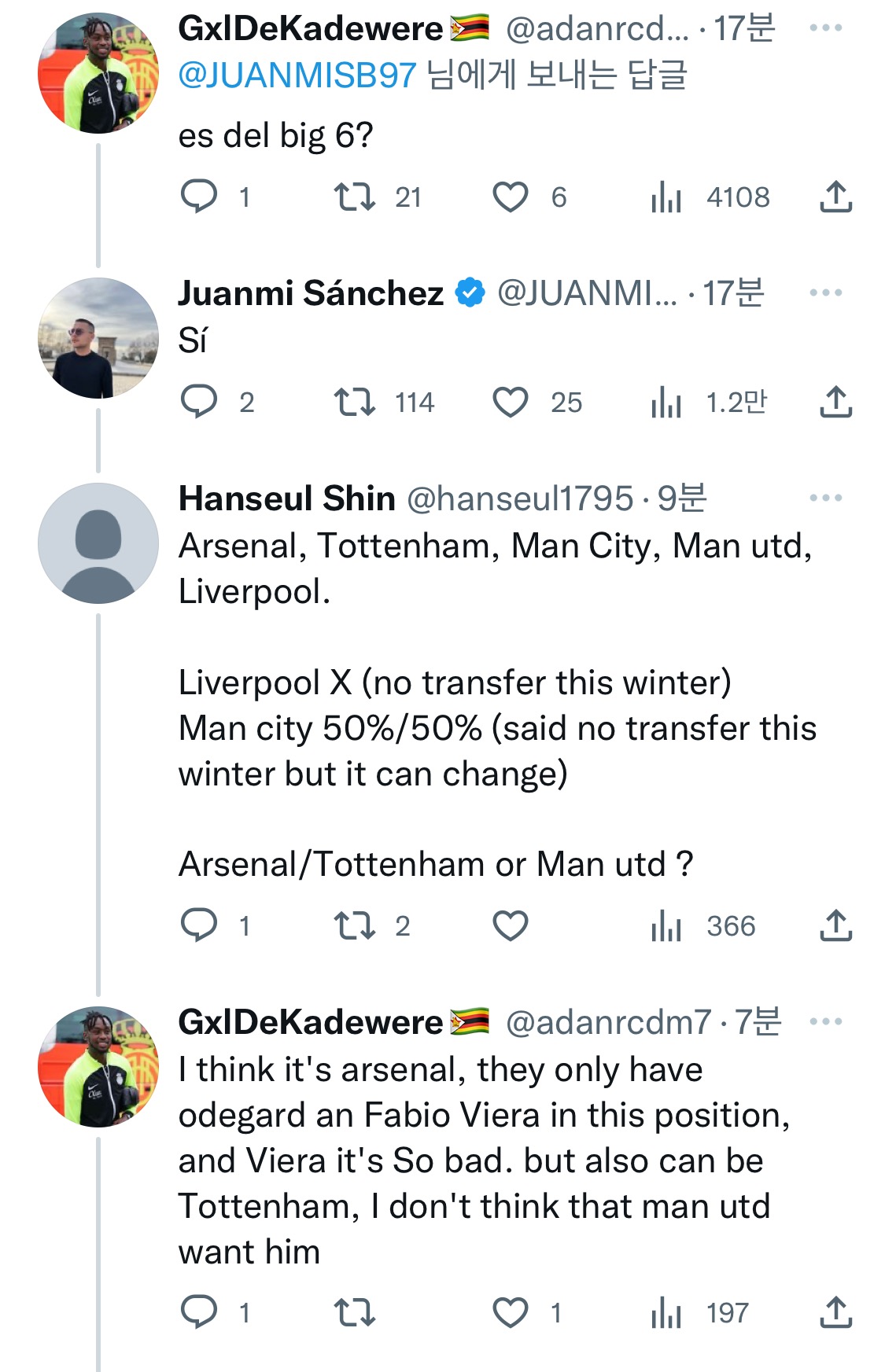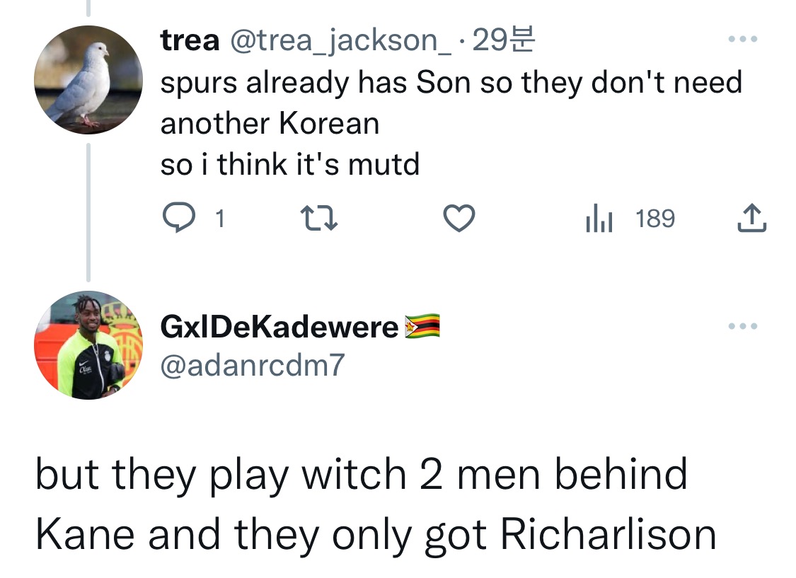 혹은 토트넘일 수도 있는데 토트넘은 쏜이 이미 있어서 한국인 플레이어를 더 원하지 않을 수도 있다고 함
