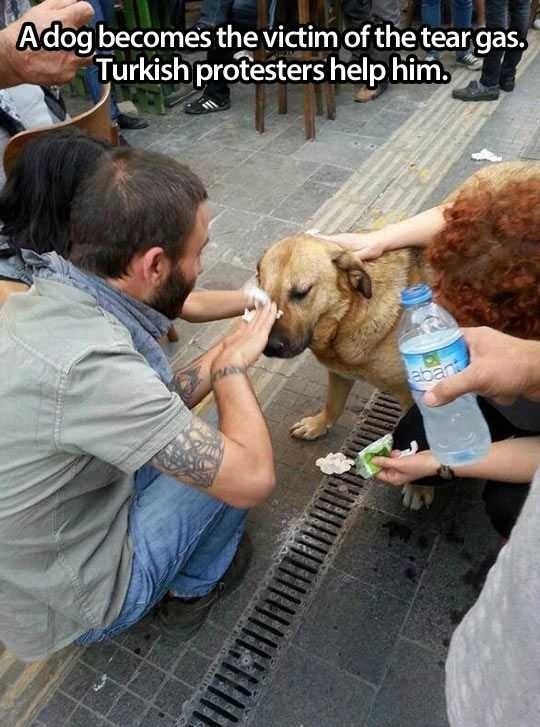 터키의 반정부 시위대들이 최류 가스 때문에 고통스러워 하는 강아지의 눈과 코를 물로 닦아주고 있다.