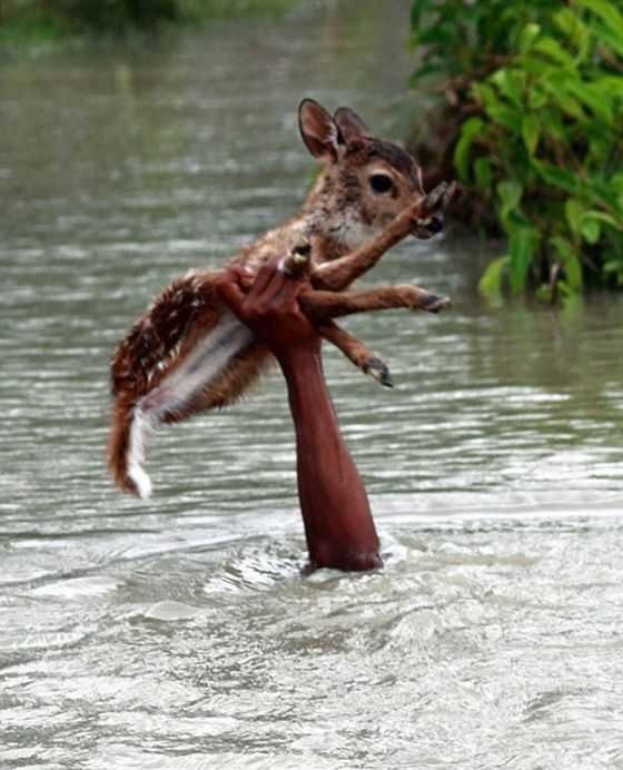 홍수가 나자 한 남성이 자신은 물에 빠져서 얼굴도 수면 아래 잠겼지만
