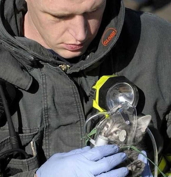 엄마 고양이가 의식을 차리지 못하자 소방관은 산소호흡기로 회복 시키려고 하고 있다.