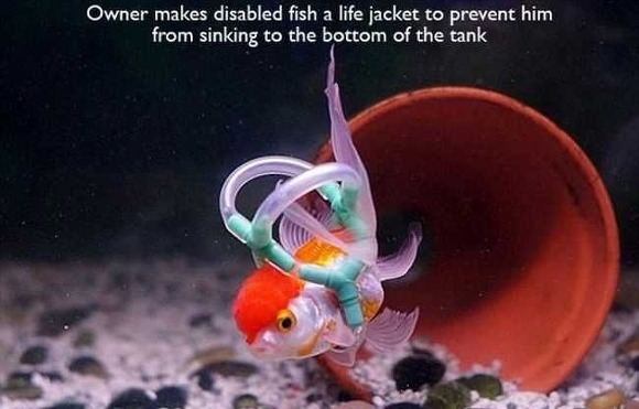 주인은 선천적인 기형으로 자꾸만 가라앉는 금붕어를 위해 수제 구명조끼를 만들어 입혔다
