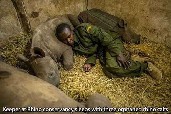 코뿔소 관리소 직원이 부모를 잃고 고아가 된 3마리의 코뿔소 새끼들과 함께 잠을 자고 있다