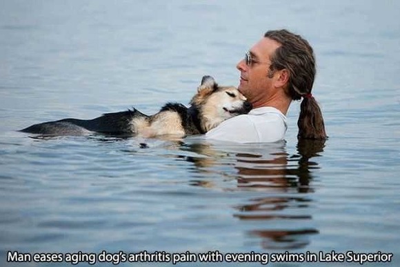 한 남성이 관절염으로 고통을 호소하는 강아지를 위해 수페리어 호수에서 함께 수영을 하고 있다.