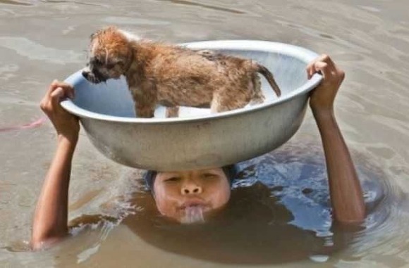 홍수가 난 지역에서 한 어린 소년이 강아지를 구하기 위해 세숫대야를 사용하고 있다