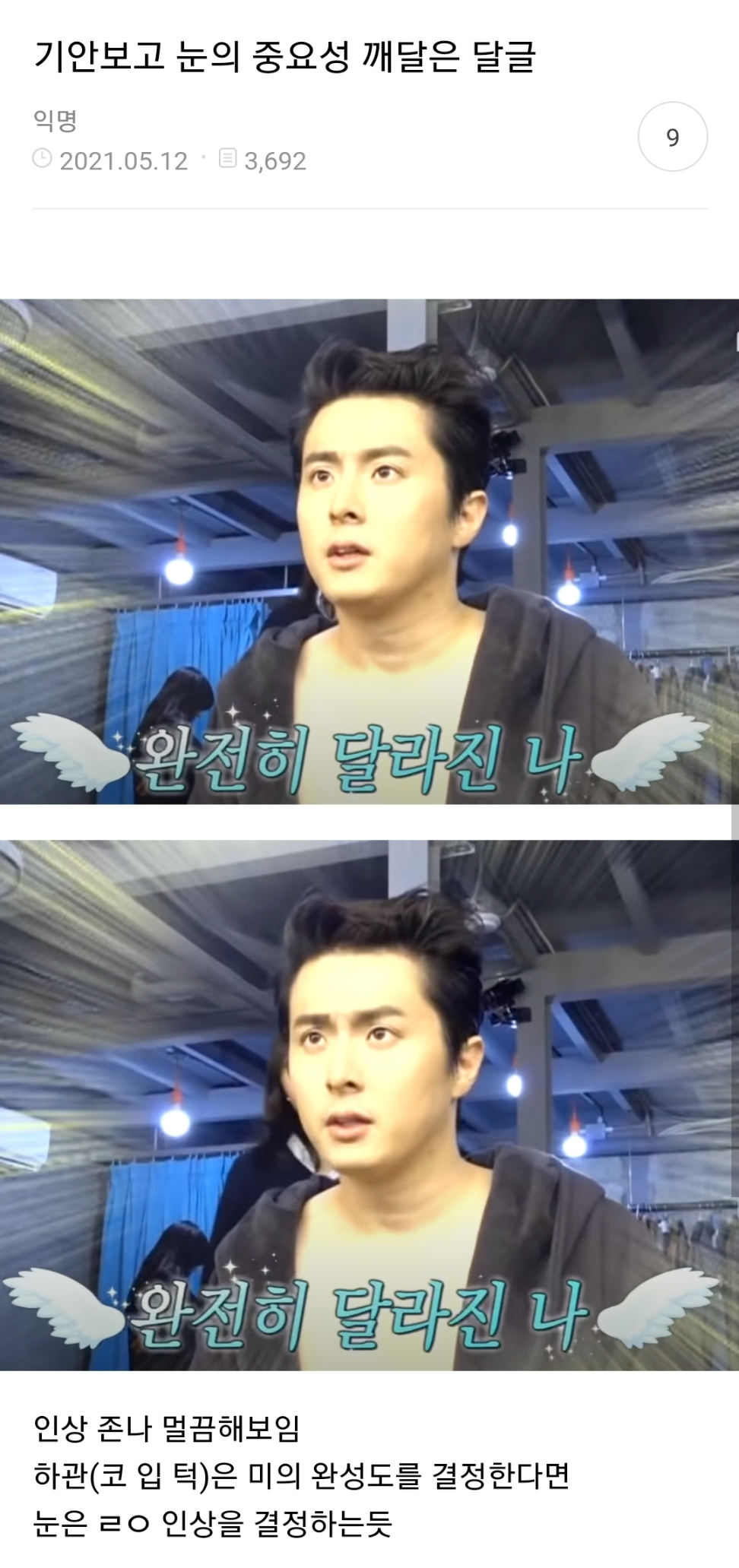 [흥미돋]기안보고 눈의 중요성 깨달은 달글 작성자무뉴우|작성시간23.02.05|조회수27,296 목록 댓글 45 글자크기 작게가 글자크기 크게가 출처 : 여성시대 https://m.cafe.daum.net/subdued20club/WFYL/95386?svc=cafeapp모든 이야기의 시작 - Daum 카페매일매일 올라오는 즐거운 카페 이야기m.cafe.daum.net 다음검색 현재 게시글 추가 기능 열기 북마크 공유하기 신고 센터로 신고 댓글 댓글 45 댓글쓰기 답글쓰기 댓글 리스트 답댓글 작성자내정보초가집 | 작성시간 23.02.06 2222....인상 달라지긴 하네 신기하다 작성자오산역 | 작성시간 23.02.05 눈이 아니라 머리스타일이랑 눈썹같은데 작성자응1년더놀게 | 작성시간 23.02.05 조명빨도 포함 쟤 피부 쥐포던데 조명으로 다 날렸잖아 작성자퇴사갈거 | 작성시간 23.02.05 다른게 안느껴진다고?? 기안 원래얼굴 진짜 못볼꼴인데 저 사진 정도면 진짜 괜찮아진거아녀?? 작성자일하기싫다진쯔 | 작성시간 23.02.05 쌍수하긴해야겠다 댓글 전체보기