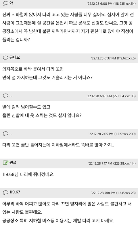 [토론싸워야제맛]지하철에서 다리 꼬는 행위 민폐다 vs 별걸다;; 작성자빵식빵식|작성시간23.02.07|조회수7,122 목록 댓글 45 글자크기 작게가 글자크기 크게가 출처 : 여성시대 빵식빵식텅텅 말고사람 많이 차있는 지하철이란걸 전제로 민폐다 입장 : 앉아있는데 옆사람이 꼬면 / 서있는데 앞사람이 꼬면 신발 끝이 내 바지에 닿을까봐 더럽고 신경쓰인다 민폐 아니다 입장 : 안닿게만 조심하면 되지 별걸 다 민폐라고 하는거같다 내가 편해서 다리 꼬고 있겠다는데 뭐가 문제 다음검색 현재 게시글 추가 기능 열기 북마크 공유하기 신고 센터로 신고 댓글 댓글 45 댓글쓰기 답글쓰기 댓글 리스트 작성자Dibab | 작성시간 23.02.07 어우 사람 많을때 절대 못하겠던데 작성자님반가워여 | 작성시간 23.02.07 첨엔 몰랐는데 나중에생각해보니까꽉찻든 아니든 예의는아니더라 작성자께끼꺼 | 작성시간 23.02.07 진짜싫어 작성자Amoroso | 작성시간 23.02.07 개짜증나 툭툭 건드는거 작성자찰떡아이스통 | 작성시간 23.02.08 민폐다 좆팔 옷에 신발 닿는 거 극혐함 댓글 전체보기