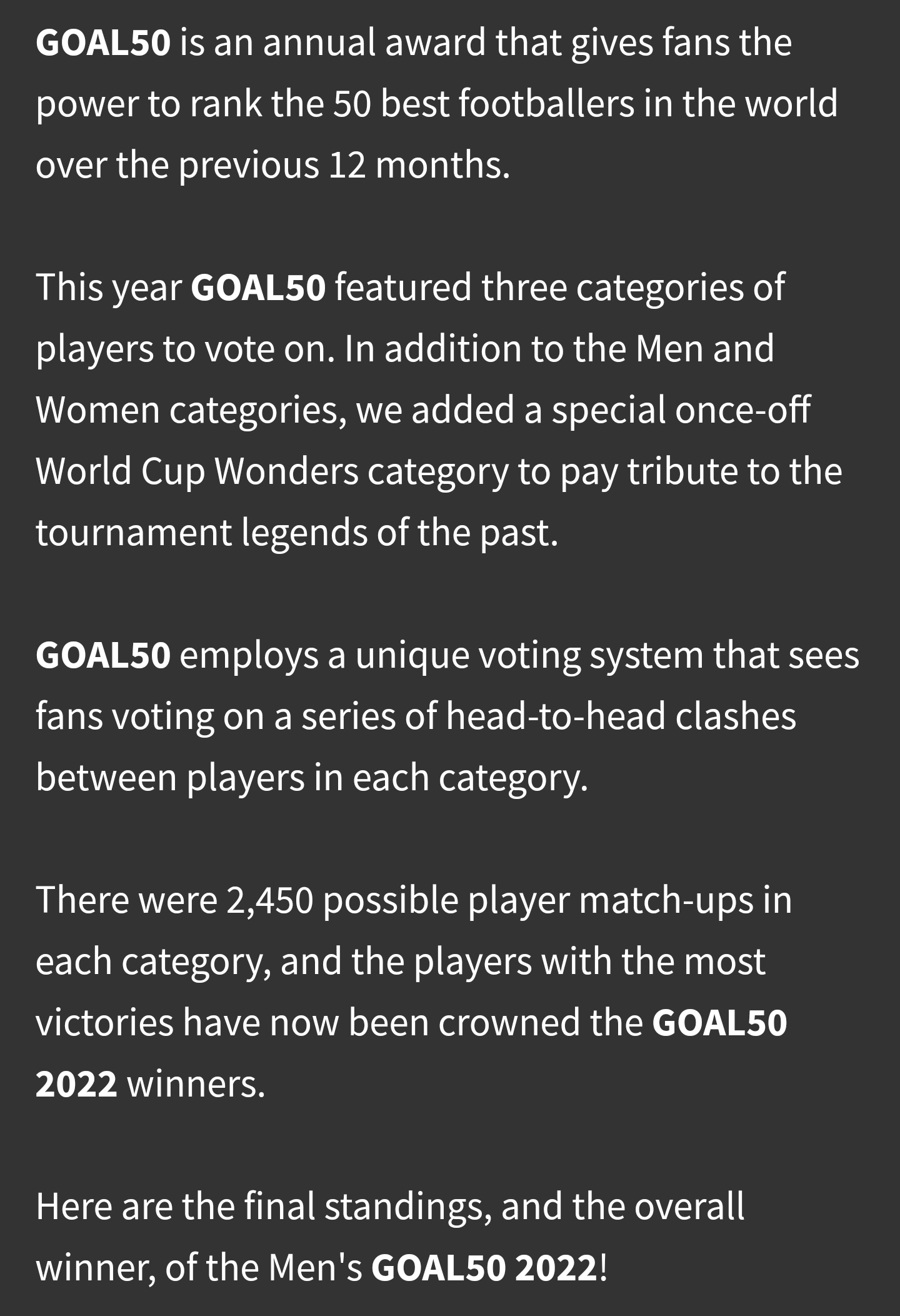 GOAL50은 축구팬들이 뽑은 지난 12개월간의 선수 순위임.