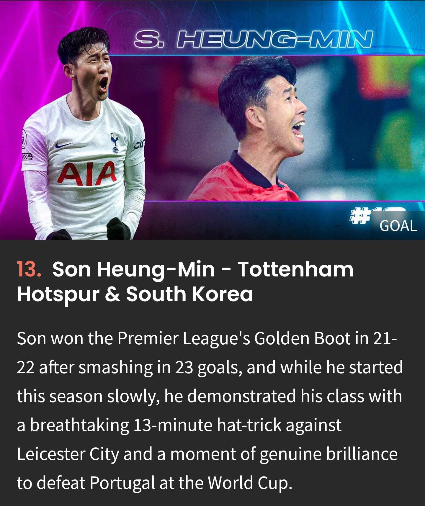 손흥민은 23골을 터트리며 21-22시즌 프리미어리그 골든부츠를 수상했고, 올 시즌 천천히 출발하고 있지만, 레스터 시티전에서 13분간 숨막히는 해트트릭을 터트리고, 월드컵에서 포르투갈을 꺾는 진정한 빛남의 순간으로 그의 클래스를 증명했다.