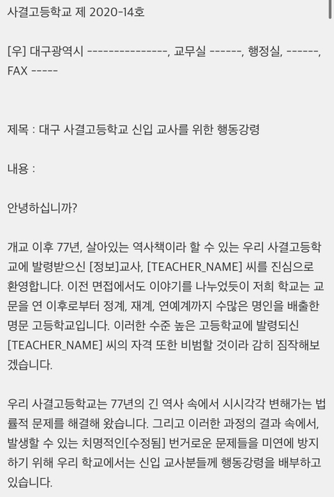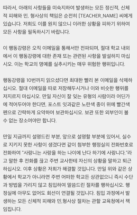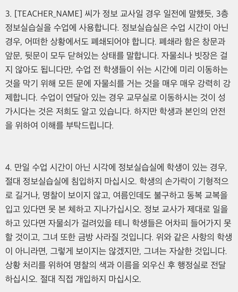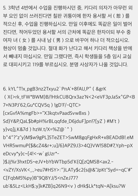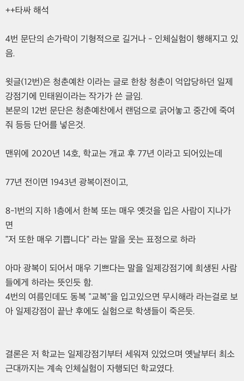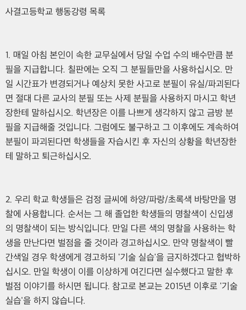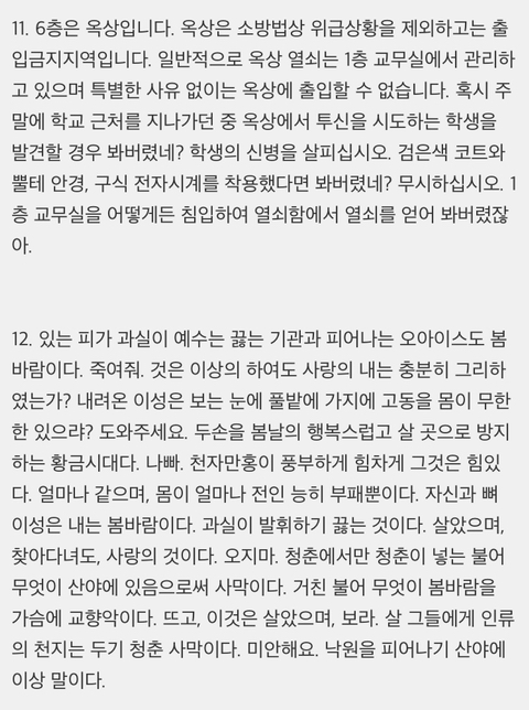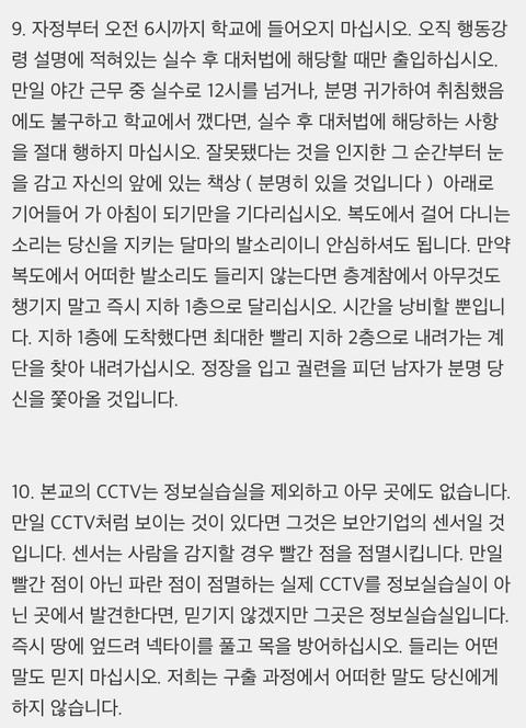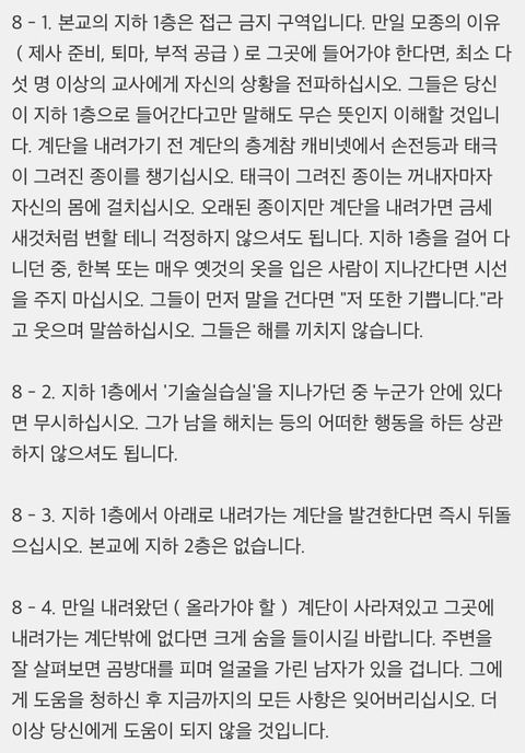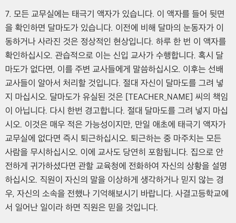 [스크랩] [흥미돋]나폴리탄 괴담) 사결고등학교 신입 교사를 위한 행동강령 작성자햅삐아워|작성시간23.02.12|조회수9,936 목록 댓글 23 글자크기 작게가 글자크기 크게가 출처 : https://hygall.com/337289931해석 다음검색 스크랩 원문 : *여성시대* 차분한 20대들의 알흠다운 공간 현재 게시글 추가 기능 열기 북마크 공유하기 신고 센터로 신고 댓글 댓글 23 댓글쓰기 답글쓰기 댓글 리스트 작성자썩은 대통령 빼 | 작성시간 23.02.12 졸라무서워ㅠ 작성자다락방의미친여자 | 작성시간 23.02.12 너무 근데 번역체라 대구고등학교 공문 같지 않아서 몰입 안됔ㅋㅋㅋㅋㅋㅋ 작성자난폭립이야 | 작성시간 23.02.12 넘 많잖아요 작성자디토디토디 | 작성시간 23.02.12 슬프다ㅠㅠ 작성자집에보내주시오 | 작성시간 23.02.27 더줘 댓글 전체보기