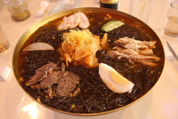 잠시 후 평양 냉면이 도착했다. 황금색 그릇 위에 검은빛의 면이 듬뿍 들어 있고 삶은 달걀, 소고기, 오이 등의 재료가 아름답게 담겨 있었다.