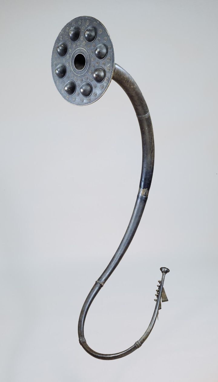청동으로 된 루어는 큰 종 머리에 구부러진 형태입니다. 똑바로 세우면 공격할 준비가 된 코브라 또는 ‘강력한 샤워기’처럼 보입니다.