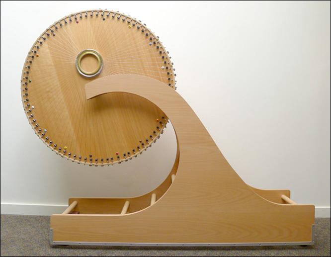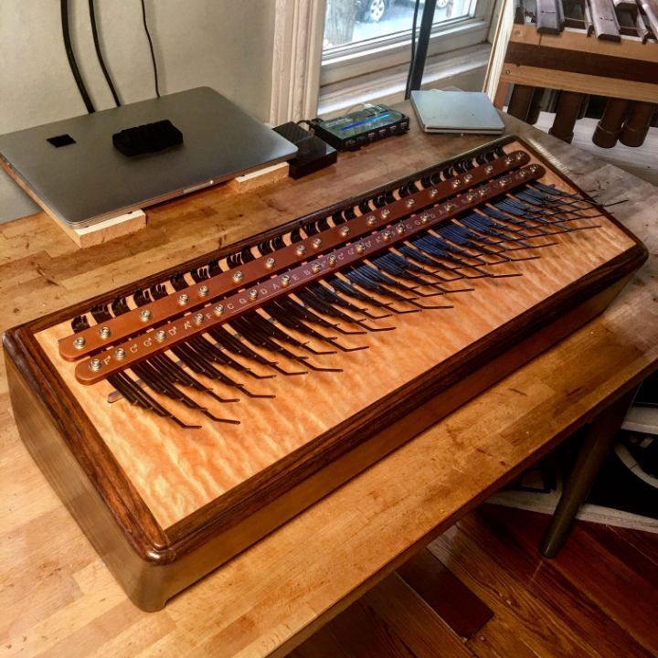 Array Mbira는 수제작 현대 악기로, 하프 또는 종과 같은 소리를 냅니다. 발명가 Bill Wesley가 만들고 Patrick Hadley, Wesley가 함께 제조했습니다.