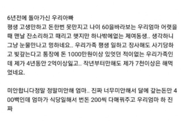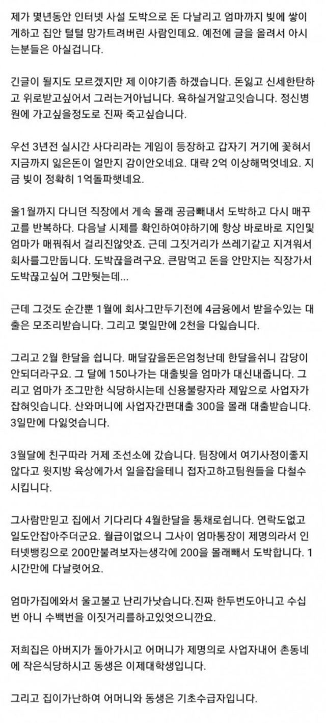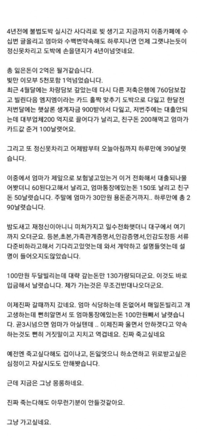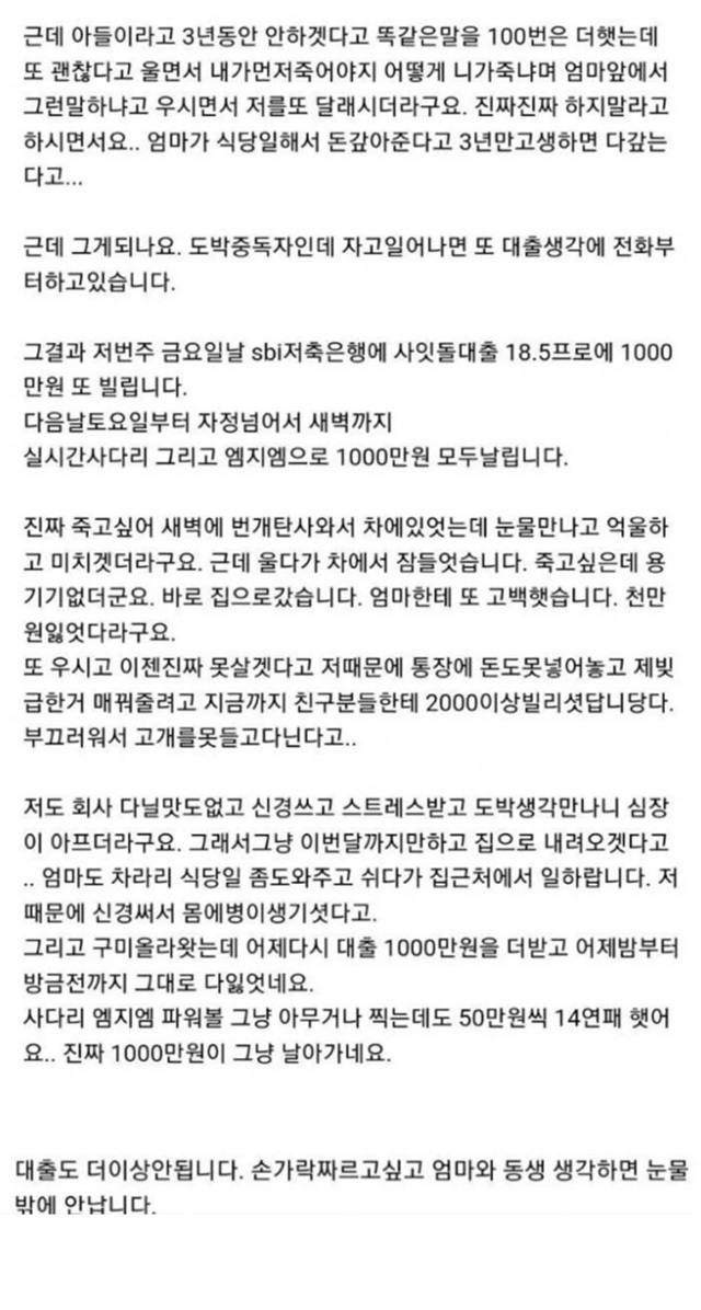 작성자고앵사랑해!! 작성시간 23.02.16 도박중독자의 가족 웹툰 보니까 중독자 가족이 제일 하면 안되는 일이 빚 갚아주는거랬어