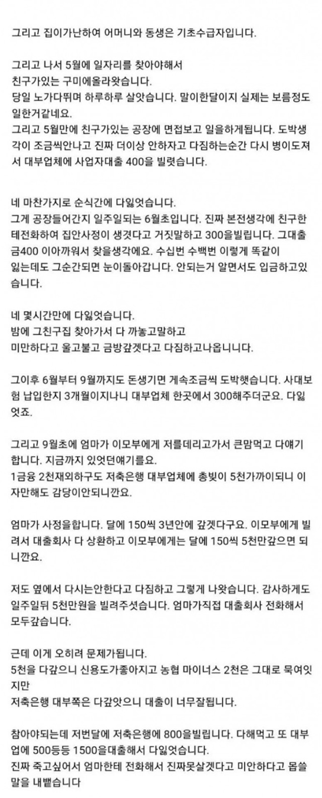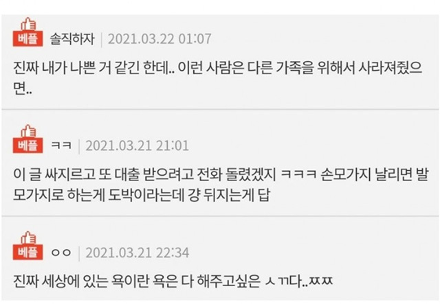 작성자귀오리 작성시간 23.02.16 부모든 자식이든 도박중독되면 자기가 저지른 빚 자기가 해결하게 해야됨