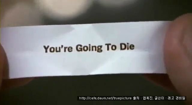 약속대로 음식값 지불 없이 가게를 나오고, 마지막으로 본 포춘 쿠키를 꺼내보는 남자.