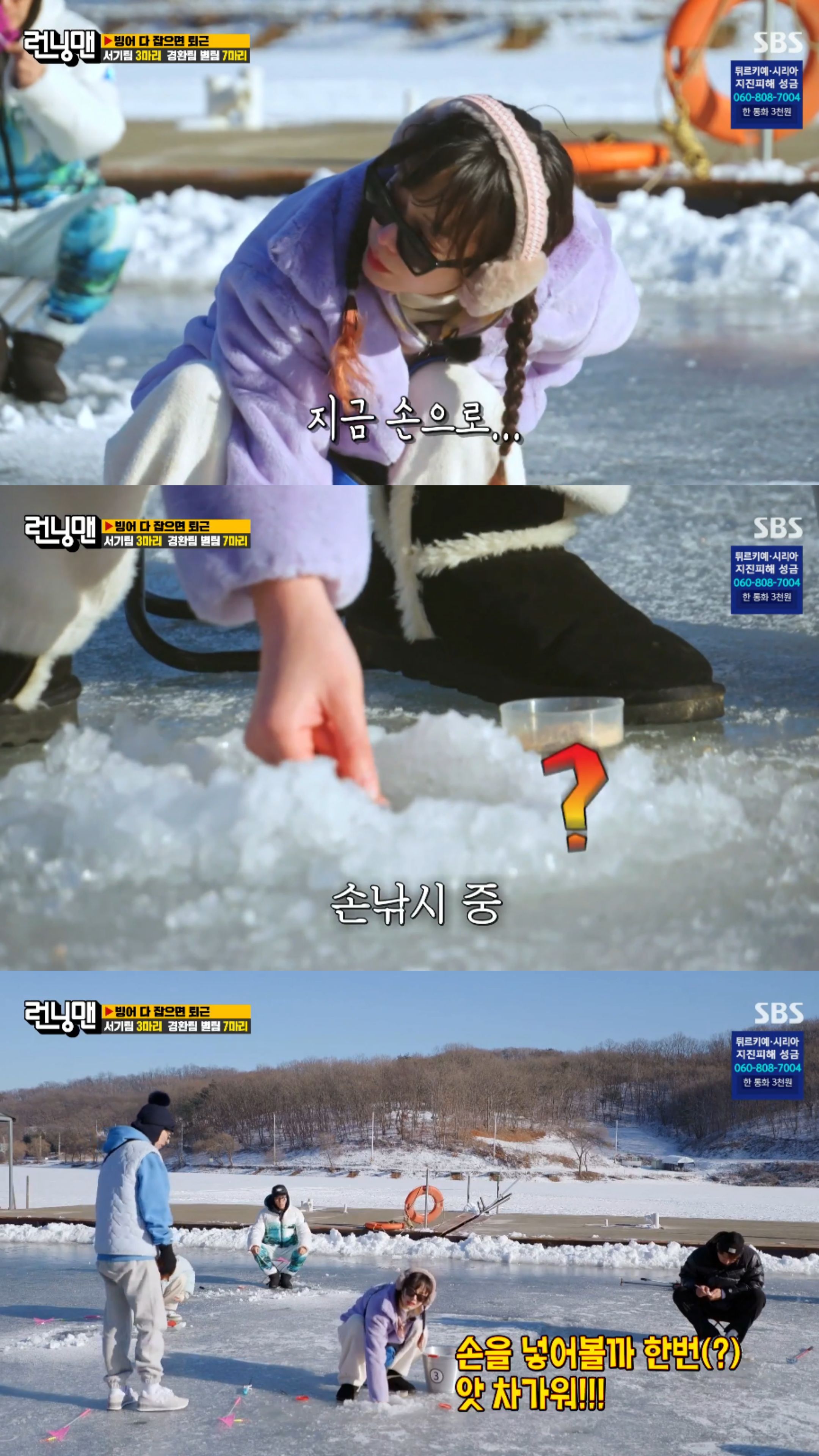 빙어잡다가 소민이 갑자기 손으로 낚시를 해보겠다는거