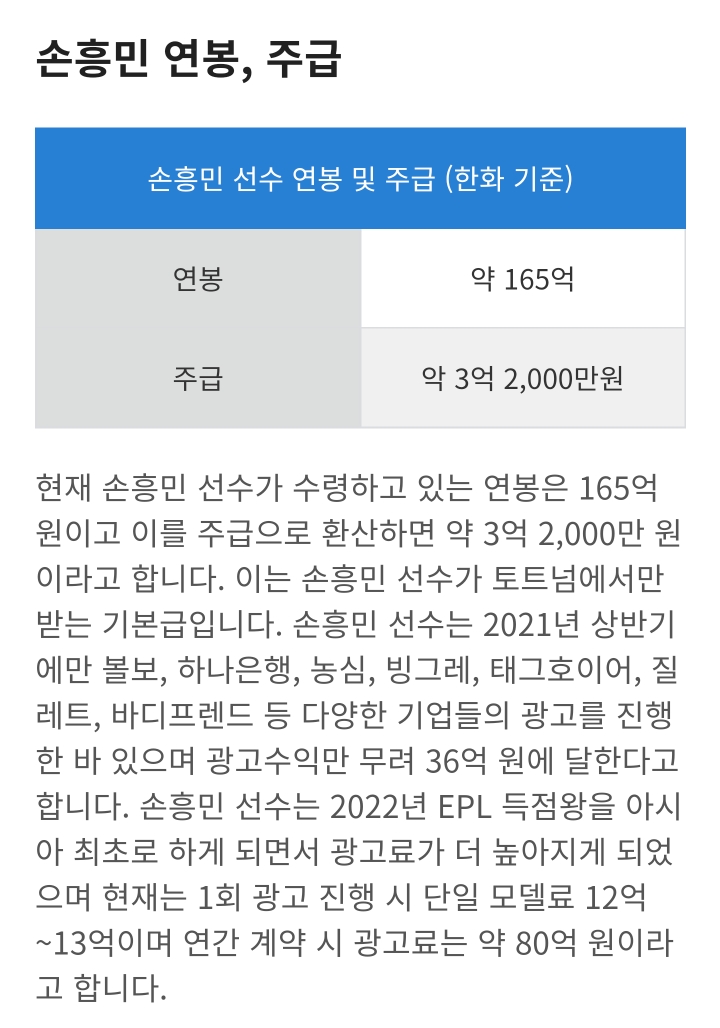 손흥민이 받는 주급은 약 3억 2천, 연봉은 약 165억