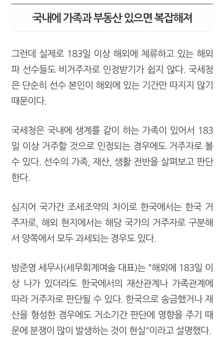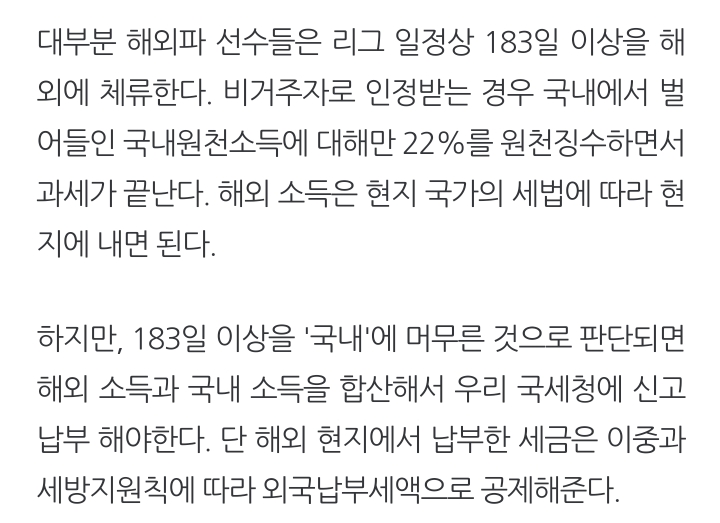 대부분 해외파 선수들은 리그 일정상 183일 이상 해외에 체류하기 때문에, 국내에서 벌어들인 수익은 국내원천소득에 대해 22% 원천징수 하면됨