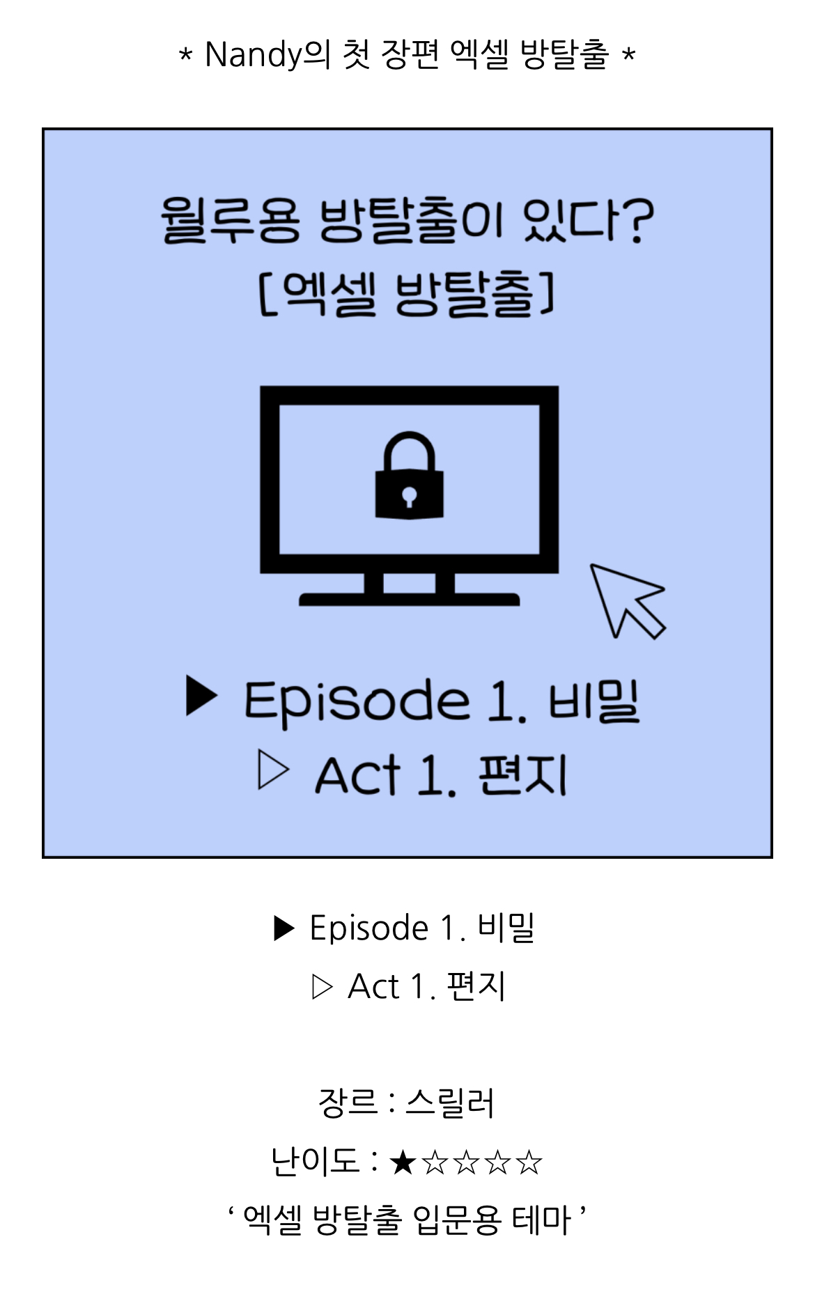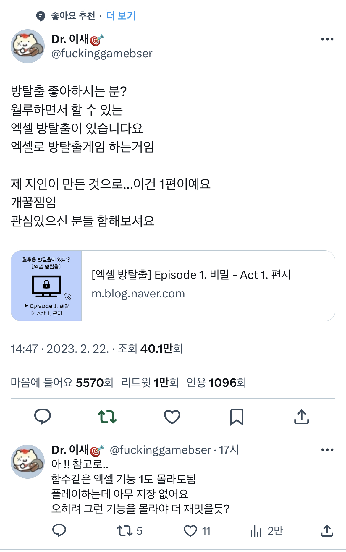 [흥미돋]월루하면서 할 수 있는 엑셀로 방탈출게임 작성자한계|작성시간23.02.23|조회수21,858 목록 댓글 1,696 글자크기 작게가 글자크기 크게가 출처 : 여성시대 한계https://twitter.com/fuckinggamebser/status/1628270307722301440?s=46&t=vtx_KdYMk0yGQ9G5FrANDwhttps://m.blog.naver.com/4490yy/223024073260[엑셀 방탈출] Episode 1. 비밀 - Act 1. 편지안녕하세요! 오늘은 평소의 방탈출 후기와는 조금 다른 게시글! 여러분은 엑셀 방탈출이란 것에 대해 들어...blog.naver.com 다음검색 현재 게시글 추가 기능 열기 북마크 공유하기 신고 센터로 신고 댓글 댓글 1,696 댓글쓰기 답글쓰기 댓글 리스트 작성자매일리즈갱신 | 작성시간 23.05.14 이따해봐야겠다 작성자내 꿈은 퇴사 | 작성시간 23.05.23 아니 독의 종류 뭐야? ㅠㅠ 작성자한국전력 | 작성시간 23.05.25 미친 졸라재믺어 작성자이홍영 | 작성시간 23.06.29 액트2 마지막 독 이름이 뭐야?? 흑 작성자비에른모스텐 | 작성시간 24.06.11 와 자물쇠 비밀번호 뭐야.... 제발 ㅠㅠㅠㅠㅠㅠㅠㅠ 댓글 전체보기