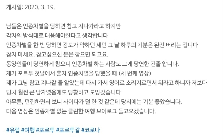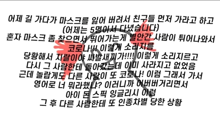 이번엔 어제 있었던 일인데 혼자 있을때 인종차별 또 당함