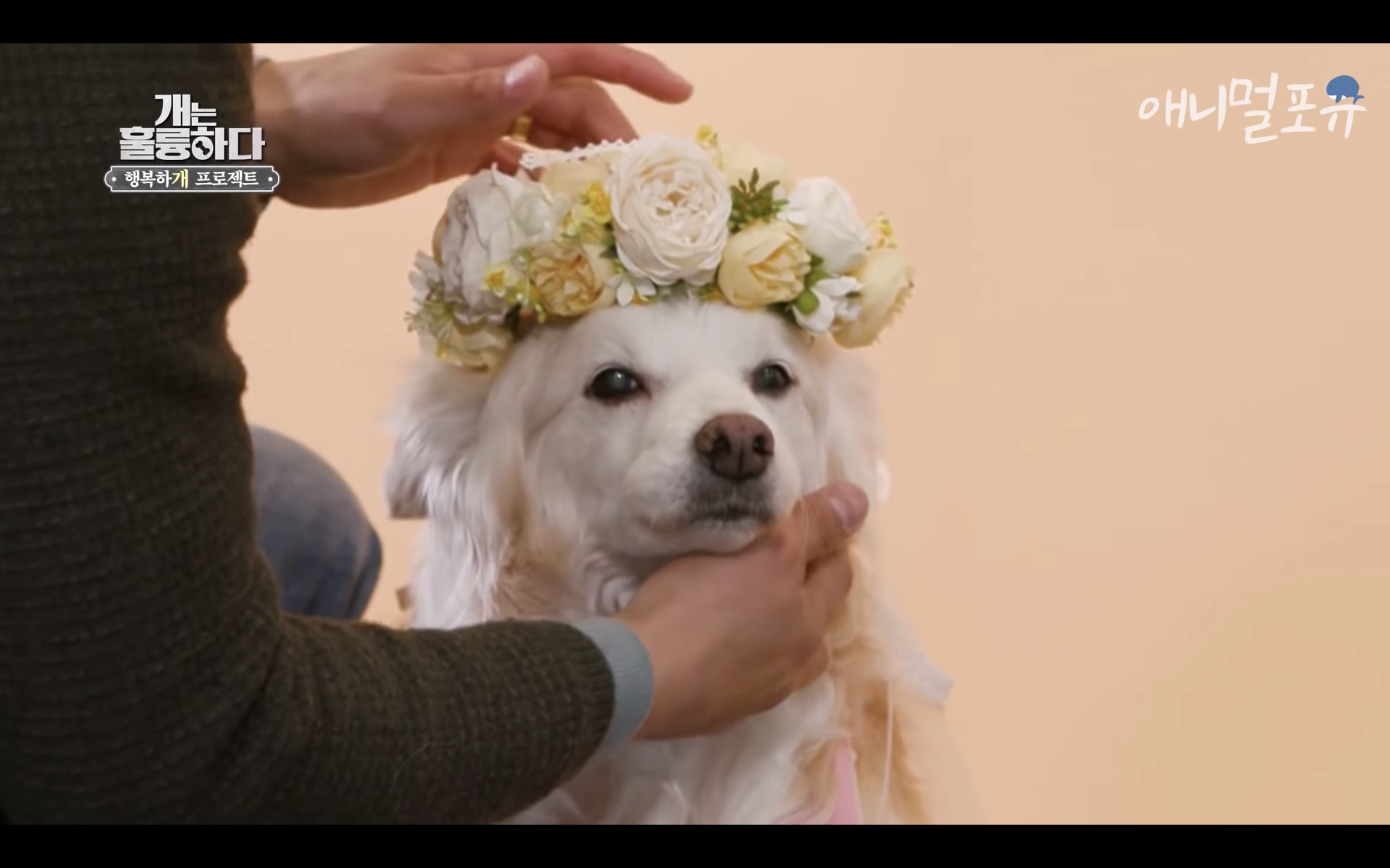 마음을 진정시키고 사진을 찍는 강형욱과 다올이. 이유비가 화관을 건내주니까 "난 이런거 안 씌워" 하다가