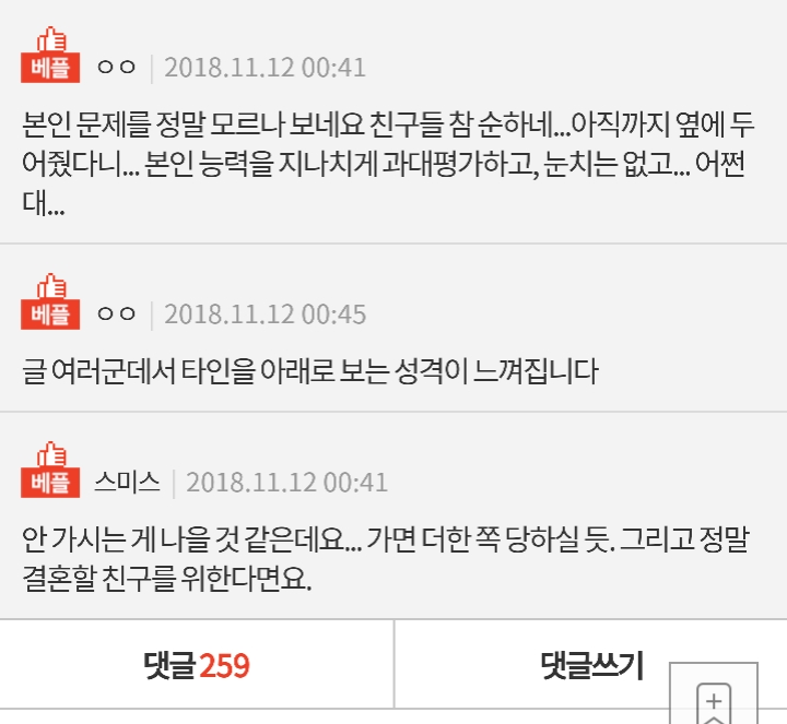 뭐라 말로 표현할순없는데 제가 되게 재수가 없고 늘 주제를 넘는대요. 이해가 잘안돼서 내가 무슨 주제없는 짓을 했냐고 했더니 그래 너는 모를줄알았다며 얘길하나해주네요.