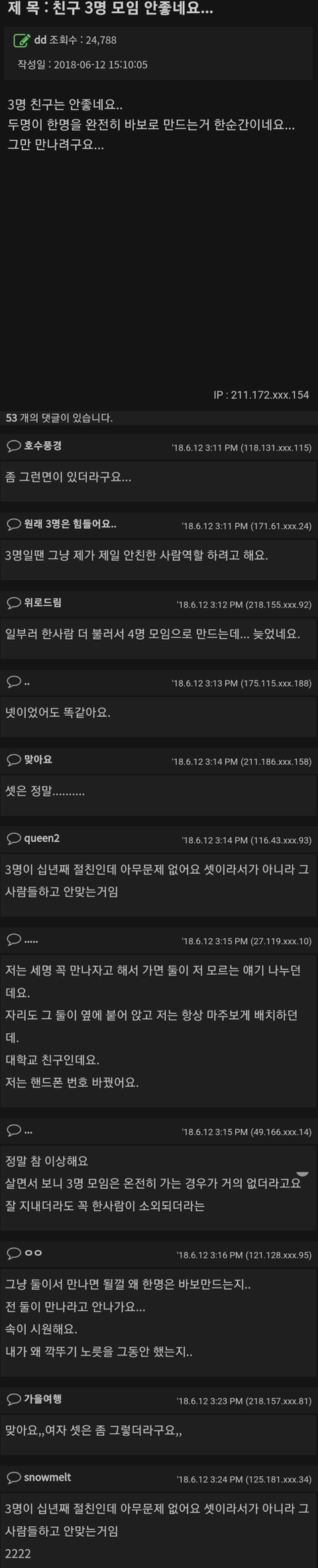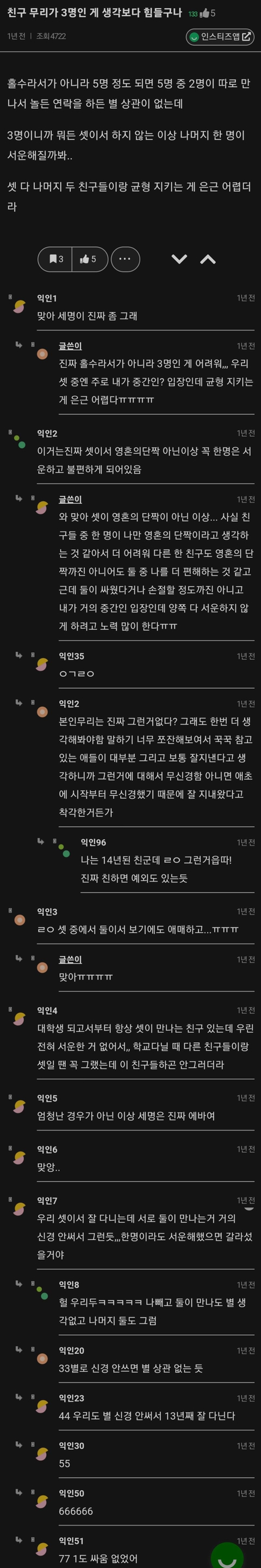 작성자숯검댕 작성시간 23.03.02 애초에 셋이면 걍 둘이 더 친해져라 관망모드인데 둘이 먼저 친해졌다가 한명 합류했을때 넘 애매하더라 쳇