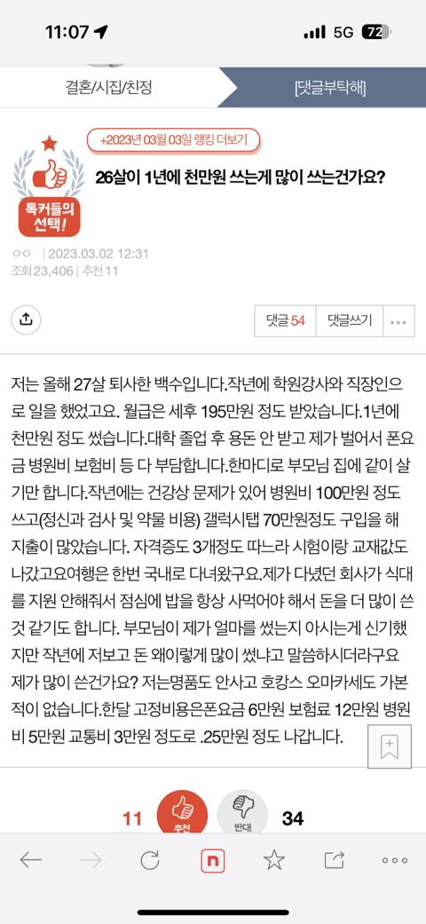 [흥미돋]26살이 1년에 천만원 쓰는게 많이 쓰는건가요? 작성자물결치다|작성시간23.03.03|조회수14,318 목록 댓글 37 글자크기 작게가 글자크기 크게가 출처 : 여성시대 물결치다https://m.pann.nate.com/talk/369448783 다음검색 현재 게시글 추가 기능 열기 북마크 공유하기 신고 센터로 신고 댓글 댓글 37 댓글쓰기 답글쓰기 댓글 리스트 작성자별의진달래 | 작성시간 23.03.04 난 이천씀ㅋㅋㅋ 저기서 식대만 천마넌 더나감 작성자284796 | 작성시간 23.03.04 점심식대없는데 저정도쓴거면 ㅈㄴ아꼈는디...자격증도 세개따고 작성자무화과맛 쿠키 | 작성시간 23.03.04 진자 검소한데 작성자Xxydo | 작성시간 23.03.04 한달에 300 쓰는데요.. 진짜 기본인데 저건 작성자젓가락으로국물안먹어짐당연함 | 작성시간 23.03.04 내 기준에 진짜조금썼는데ㅋㅋㅋ 댓글 전체보기