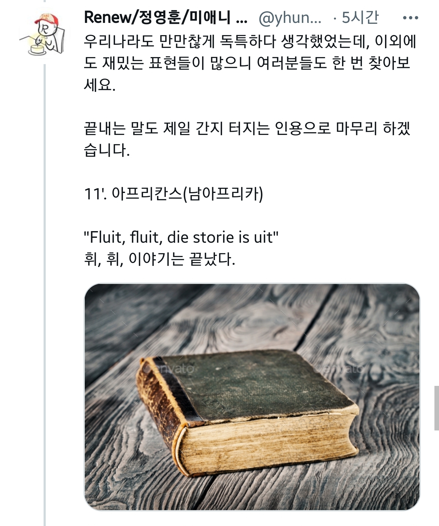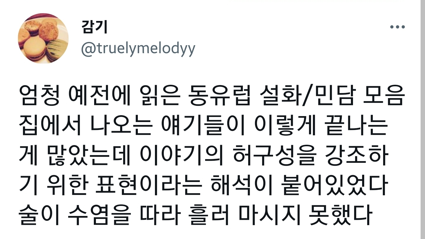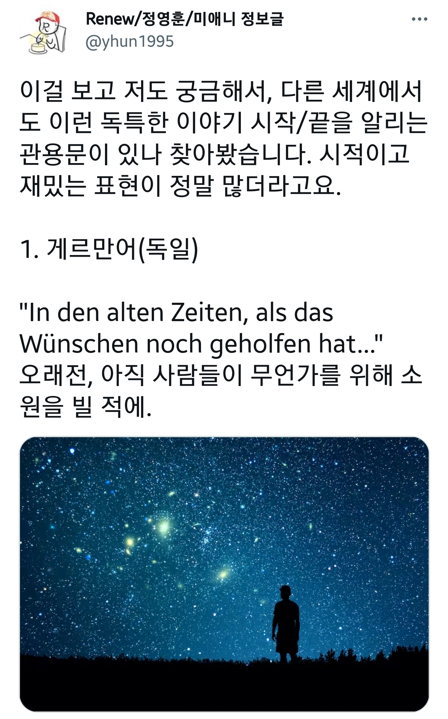 작성자얼죽아 협회장 작성시간 23.03.05 진짜 진짜 흥미돋이닼ㅋㅋㅋㅋ우리나라 끝맺음은 진짜 오래오래 행복하게 살았답니다밖에 생각이 안 나는데 영어권의 they lived happily ever after에서 온 것 같고... 호랑이 담배피던 시절같은 정도의 문구는 딱히 없나! 이야기 읽어본지가 넘 오래돼서 생각이 안 나네 ㅋㅋ