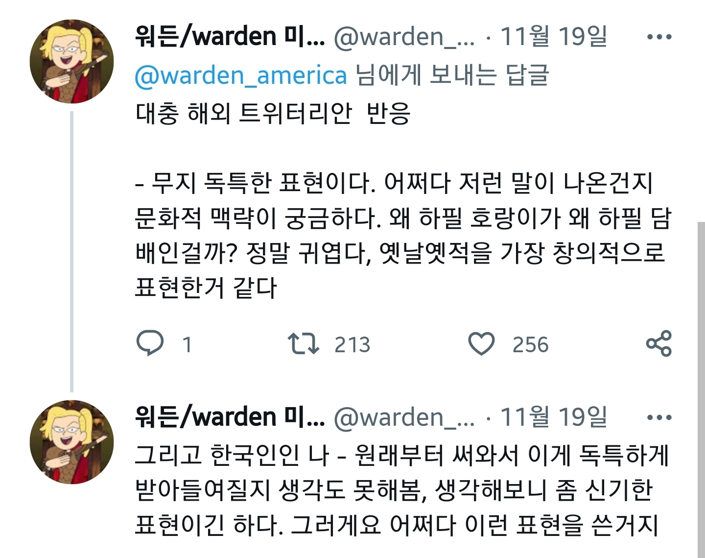 작성자오늘 먹은 딸기 존맛 딸기 작성시간 23.03.05 헐 넘 재밌다! 각 나라마다 표현하는게 다른데 그게 또 신기하고 재밌고 뭔가 진짜 마음에 콕 박힘ㅋㅋ!!! 표현 진짜 멋지다... 우리나라것도 익숙해서 몰랐는데 재치넘치곸ㅋㅋ