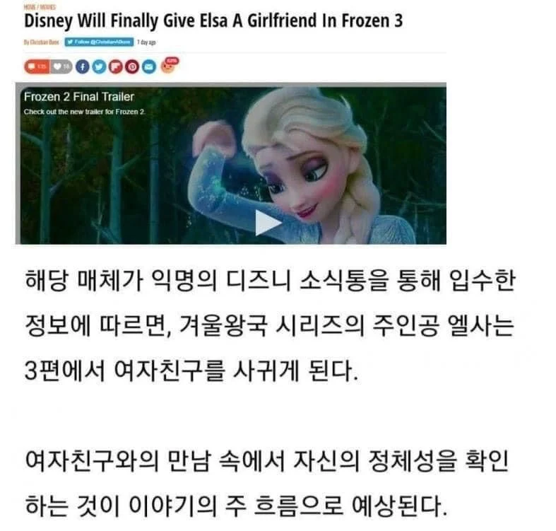 2편에서 엘사가 레즈비언으로 나오고 3편에서 여자친구가 나올거같다는 루머 기사임