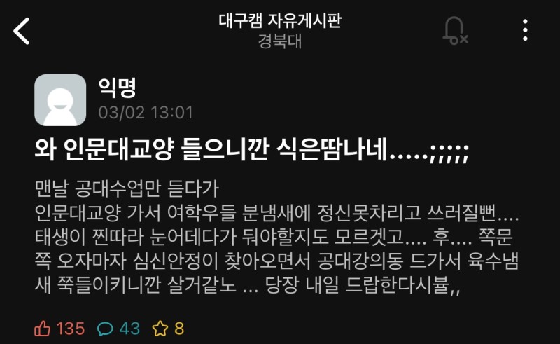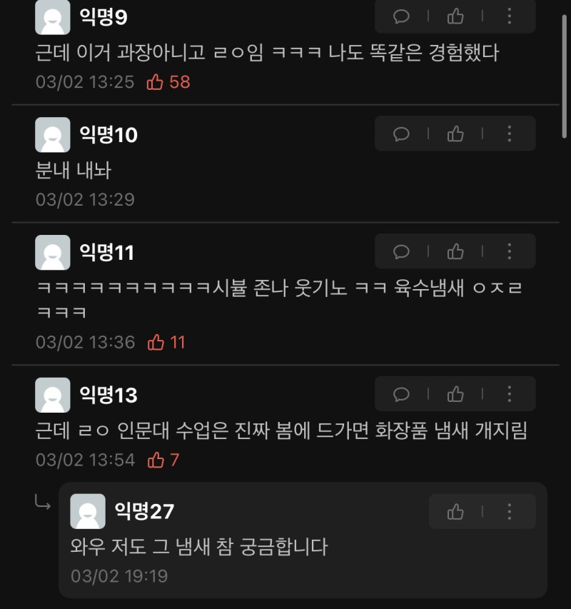 [기타]와 인문대교양 들으니깐 식은땀나네;;; 작성자popoo|작성시간23.03.05|조회수12,309 목록 댓글 51 글자크기 작게가 글자크기 크게가 출처 : https://m.enuri.com/knowcom/detail.jsp?kbno=2925462분냄새;;; 다음검색 현재 게시글 추가 기능 열기 북마크 공유하기 신고 센터로 신고 댓글 댓글 51 댓글쓰기 답글쓰기 댓글 리스트 작성자디토처돌이 | 작성시간 23.03.05 시발 진짜 싫다 작성자어차피뒤질인생 | 작성시간 23.03.05 좀 씻어라 ㅅㅂ. 작성자쭈쭈꾸꾸 | 작성시간 23.03.05 공대 강의실 냄새나ㅜ 작성자크리스토퍼개쌉놀란 | 작성시간 23.03.05 으악 ㅠ진짜릻어ㅠ 작성자팔도비빔장 | 작성시간 23.03.05 분냄새? 요새 50대도 분이라고 말 안하겠다 댓글 전체보기