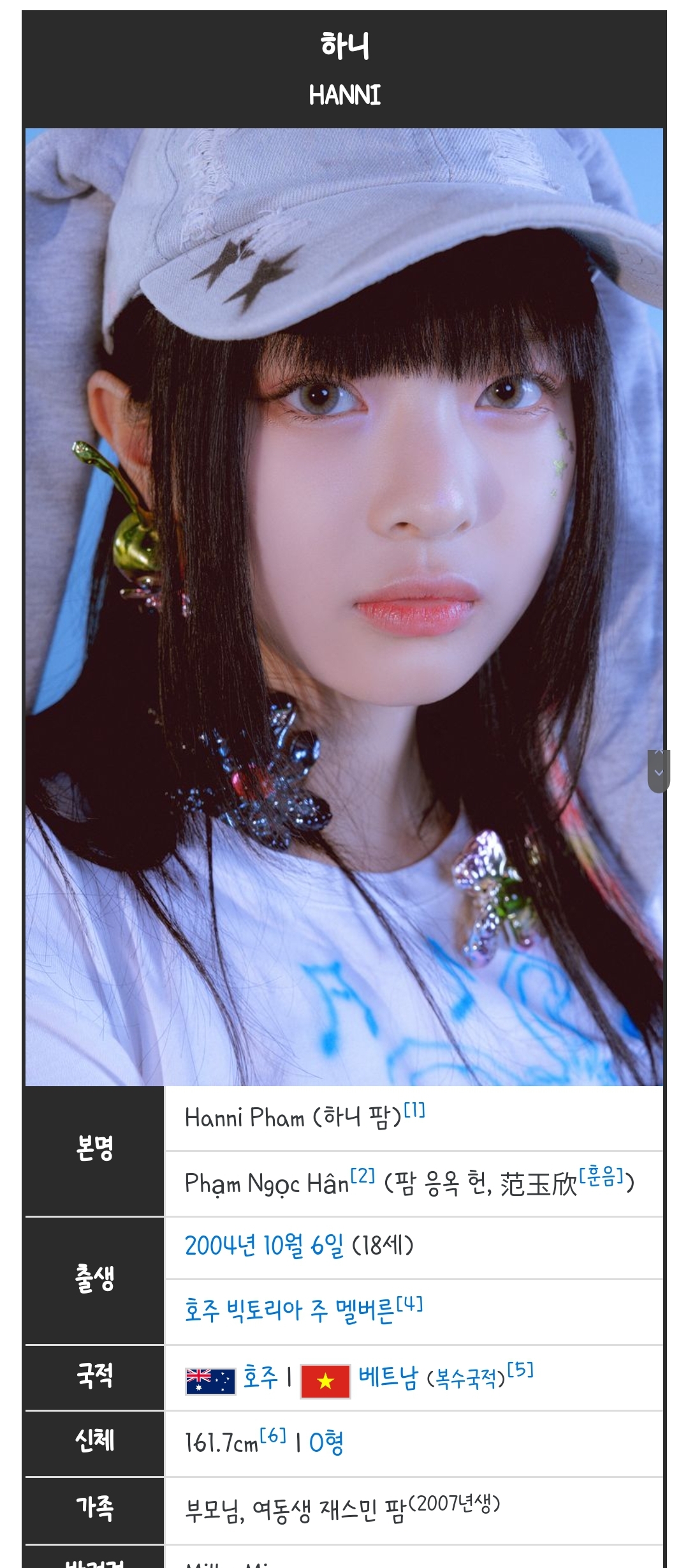[흥미돋]뉴진스 하니가 왜 팜하니야?? 작성자(본인 닉네임)_|작성시간23.03.05|조회수47,862 목록 댓글 47 글자크기 작게가 글자크기 크게가 출처 : 여성시대 (본인 닉네임)_팜하니는 무슨 뜻이야???팜하니 쳤을때 상위검색어 팜하니 뜻알고보니 성이 팜씨였음부모님 두분 다 베트남 분이시래....!난 재외교포인 줄 알았음 다음검색 현재 게시글 추가 기능 열기 북마크 공유하기 신고 센터로 신고 댓글 댓글 47 댓글쓰기 답글쓰기 댓글 리스트 작성자여돌좀패지마 | 작성시간 23.03.06 팜하니로 이름하지 작성자파워12345 | 작성시간 23.03.06 애기때 사진 넘귀엽닼ㅋㅋㅋ 작성자쑥치즈타르트 | 작성시간 23.03.06 헐!!!!!!?!한국인이아니엿어 첨알음 작성자일단뒤어 | 작성시간 23.03.06 팜떤여성 사랑해 작성자유누미 | 작성시간 23.04.29 베트남 사람이구나 댓글 전체보기