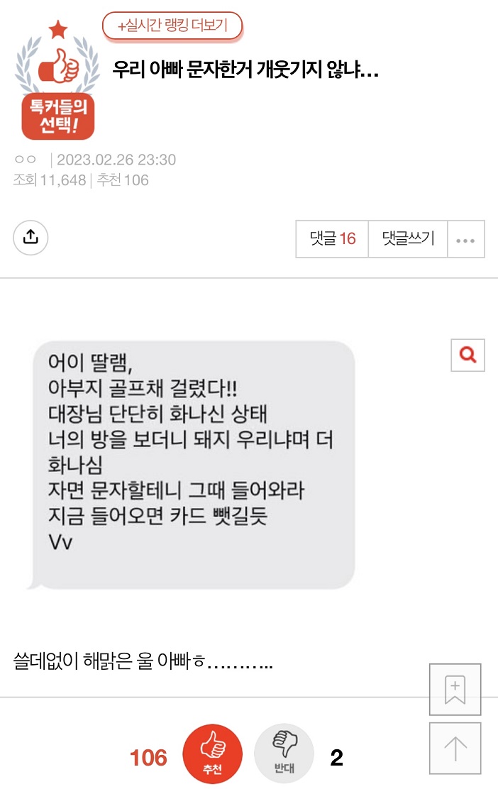 작성자mancity 작성시간 23.03.06 딸램 대장님 화나심 뺏길듯 하고 브이까지 ㅋㅋㅋㅋ 하나하나 거를거 없다곸ㅋㅋㅋㅋ