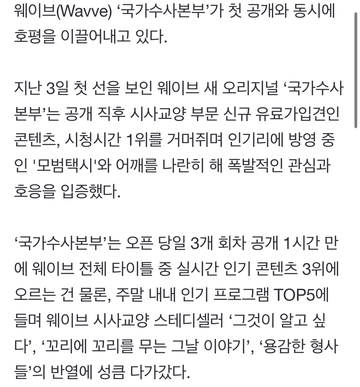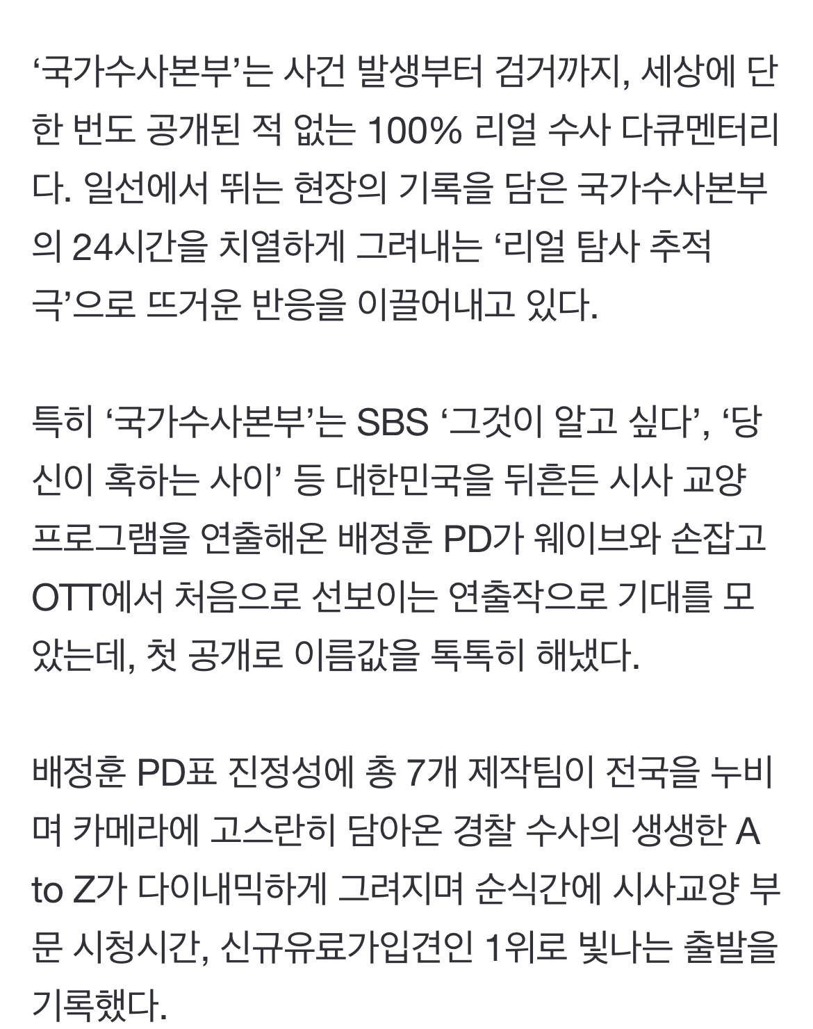 [여시뉴스데스크]‘그알’ PD 배정훈표 진정성 통했다…이름값 톡톡히(국가수사본부) 작성자Life is C between B and D|작성시간23.03.06|조회수6,316 목록 댓글 6 글자크기 작게가 글자크기 크게가 출처 : https://n.news.naver.com/entertain/article/382/0001036673‘그알’ PD 배정훈표 진정성 통했다…이름값 톡톡히(국가수사본부)웨이브(Wavve) ‘국가수사본부’가 첫 공개와 동시에 호평을 이끌어내고 있다. 지난 3일 첫 선을 보인 웨이브 새 오리지널 ‘국가수사본부’는 공개 직후 시사교양 부문 신규 유료가입견인 콘텐n.news.naver.com(후략) 다음검색 현재 게시글 추가 기능 열기 북마크 공유하기 신고 센터로 신고 댓글 댓글 6 댓글쓰기 답글쓰기 댓글 리스트 작성자찜틀사야해 | 작성시간 23.03.06 4화 언제 나와… 답댓글 작성자어제보다오늘더 | 작성시간 23.03.06 매주 금요일마다 업데이트 된다더라 답댓글 작성자찜틀사야해 | 작성시간 23.03.06 어제보다오늘더 너무 고마워…검색해도 안나와서 😭 작성자김펭귄 | 작성시간 23.03.06 진짜 너무 재밌어 작성자젤잘생긴새쓰끼 | 작성시간 23.03.06 진짜 재밌더라 댓글 전체보기