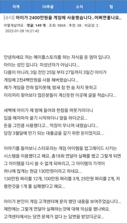 [기타]아이가 2400만원을 게임에 사용했습니다.. 어쩌면좋나요 작성자popoo|작성시간23.03.07|조회수28,443 목록 댓글 301 글자크기 작게가 글자크기 크게가 출처 : https://m.ruliweb.com/community/board/300143/read/55691841 다음검색 현재 게시글 추가 기능 열기 북마크 공유하기 신고 센터로 신고 댓글 댓글 301 댓글쓰기 답글쓰기 댓글 리스트 작성자걸스데이 | 작성시간 23.03.08 아이 집어쳐라진짜 작성자재가입 하 씨 | 작성시간 23.03.08 성인 ㅋ 작성자악플로대응할게~ | 작성시간 23.03.08 성인인데 엄마가 어쩌면 좋나요 이런글 쓰고 다녀야돼? 작성자징검다리휴일 | 작성시간 23.03.08 먼시바 애??? 작성자국밥 | 작성시간 23.03.11 제목보고 애인줄 알았는데 성인이라고??? 저게 수단이 게임이어서 그렇지 돈 쓴 과정 보니 도박중독이랑 똑같은 패턴인거같은데 댓글 전체보기