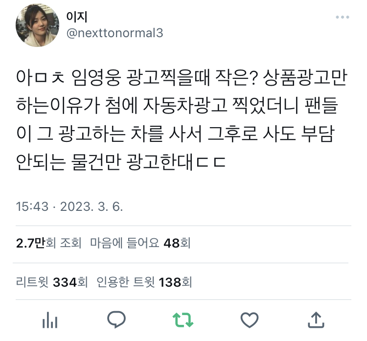 [기타]임영웅이 작은 상품광고만 찍는 이유 작성자르뱅쿠키|작성시간23.03.07|조회수35,583 목록 댓글 152 글자크기 작게가 글자크기 크게가 출처 : https://twitter.com/nexttonormal3/status/1632632907201392640?s=46&t=V4fKjpH_lM3rp2-zfpwPHA내개비야 다음검색 현재 게시글 추가 기능 열기 북마크 공유하기 신고 센터로 신고 댓글 댓글 152 댓글쓰기 답글쓰기 댓글 리스트 작성자쌉졸귀 | 작성시간 23.03.09 와 작성자먀용먀용 | 작성시간 23.03.09 대단한데..!? 팬들 능력 오진다 작성자농구공보관함 | 작성시간 23.03.09 엽떡 한번만 ㅠㅠ! 작성자퇴근해 | 작성시간 23.03.09 인기쩌는데 이유가있네!! 작성자마쵸킹 | 작성시간 23.03.09 동물학대금지 유기견입양+이동봉사 마당에 동물 묶어놓고 키우지 않기 캠페인 부탁드려요 영웅씌... 댓글 전체보기