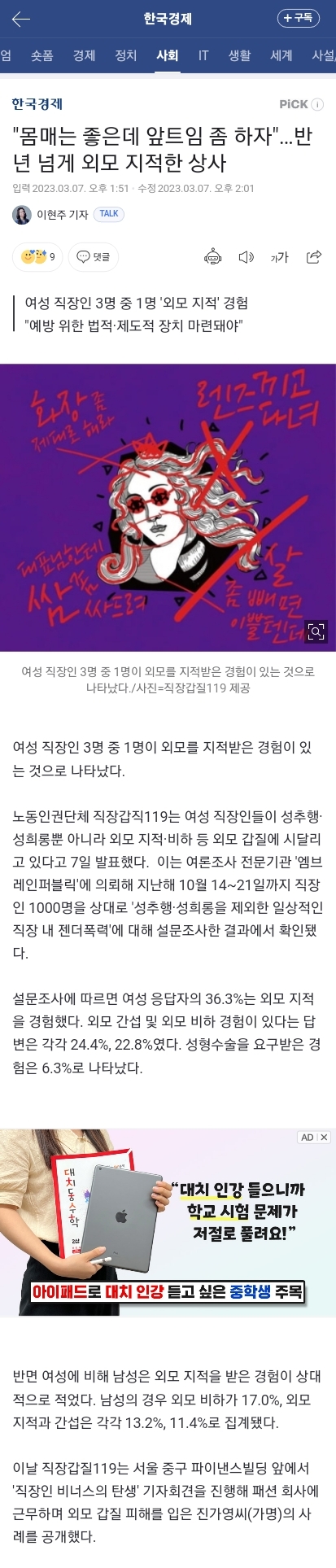 [여시뉴스데스크]"몸매는 좋은데 앞트임 좀 하자"…반년 넘게 외모 지적한 상사 작성자트트치치|작성시간23.03.07|조회수3,279 목록 댓글 4 글자크기 작게가 글자크기 크게가 출처 : https://n.news.naver.com/article/015/0004817977?sid=102"몸매는 좋은데 앞트임 좀 하자"…반년 넘게 외모 지적한 상사여성 직장인 3명 중 1명이 외모를 지적받은 경험이 있는 것으로 나타났다. 노동인권단체 직장갑직119는 여성 직장인들이 성추행·성희롱뿐 아니라 외모 지적·비하 등 외모 갑질에 시달리고 있다n.news.naver.com 다음검색 현재 게시글 추가 기능 열기 북마크 공유하기 신고 센터로 신고 댓글 댓글 4 댓글쓰기 답글쓰기 댓글 리스트 작성자비싸면 차라리 싼 것이제 | 작성시간 23.03.07 나도 맨날 꾸미면 좋겠다 꾸몄으면 좋겠다 햇음 옷좀 사라고 대머리에 키는 165였는데 작성자먹는거먹는거먹는거 | 작성시간 23.03.07 남자가 외모지적과 간섭을 들어..? 걍 머리빗고 씻으란 소리 듣고 발광하는게 아니고..? 작성자그리움의문을열고 | 작성시간 23.03.07 시발 남직원들 얼굴로 죄다 갈구는 문화 생겨야 작성자주4일근무소취 | 작성시간 23.03.07 너부터해 댓글 전체보기